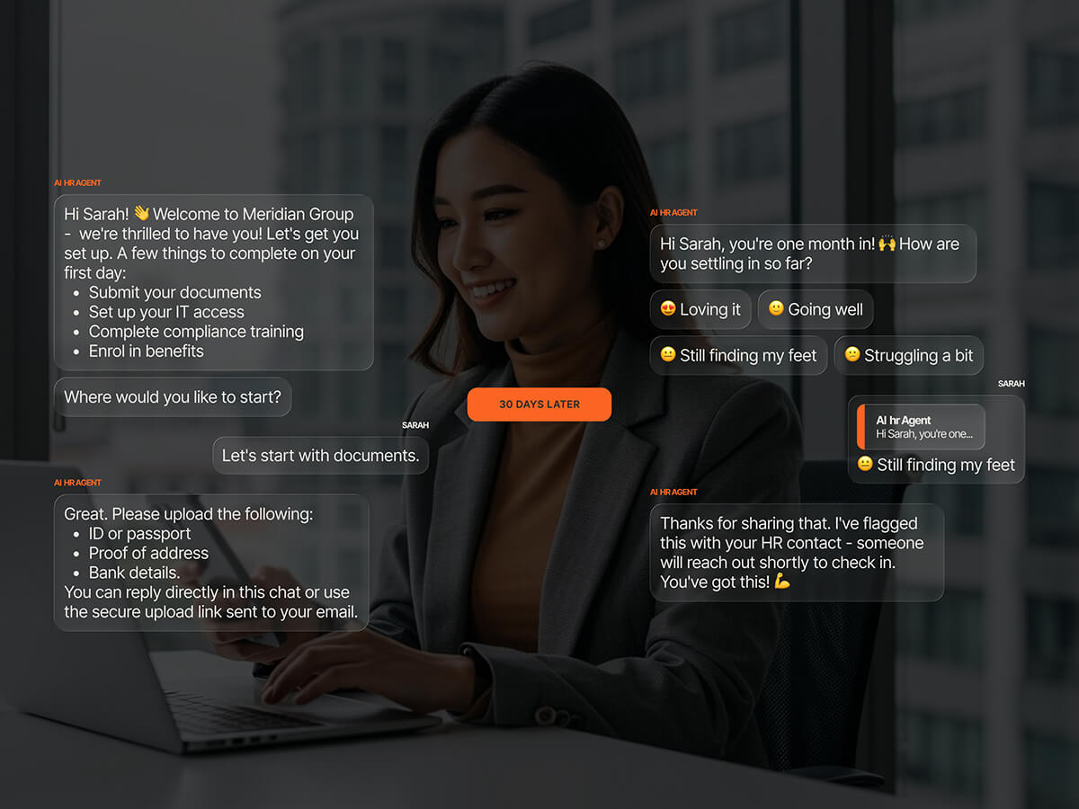 AgentOS deploys AI agents across WhatsApp, SMS, web chat, voice, and internal messaging platforms. They answer employee questions instantly, automate recruitment workflows, guide new hires through onboarding, and escalate sensitive matters to the right HR professional with full context.