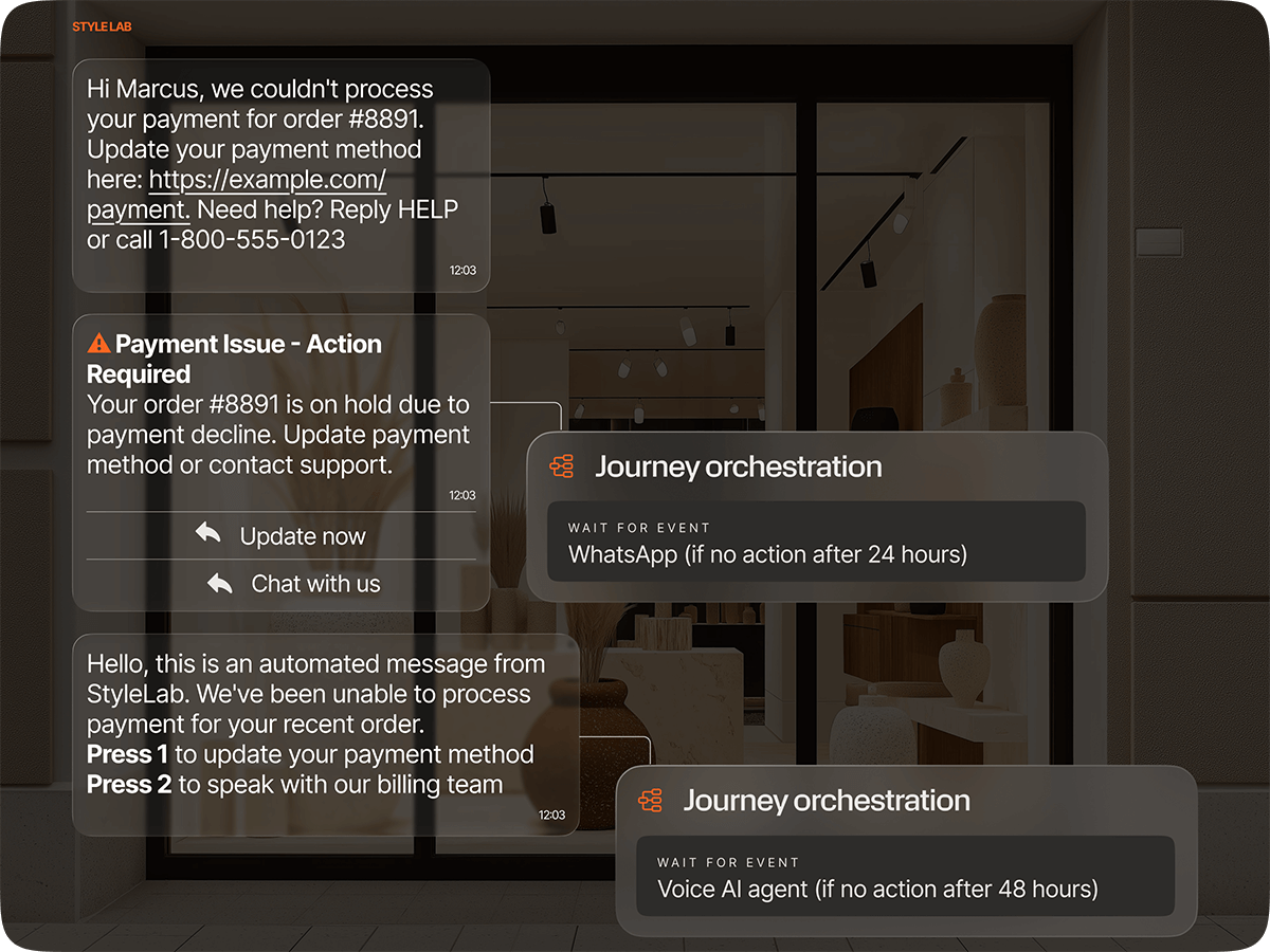 Broadcast campaigns to millions across 15+ native channels including SMS, email, WhatsApp, RCS, push notifications, and voice. Automatic failover routes messages through backup channels when primary delivery fails, so your campaigns always reach their audience.