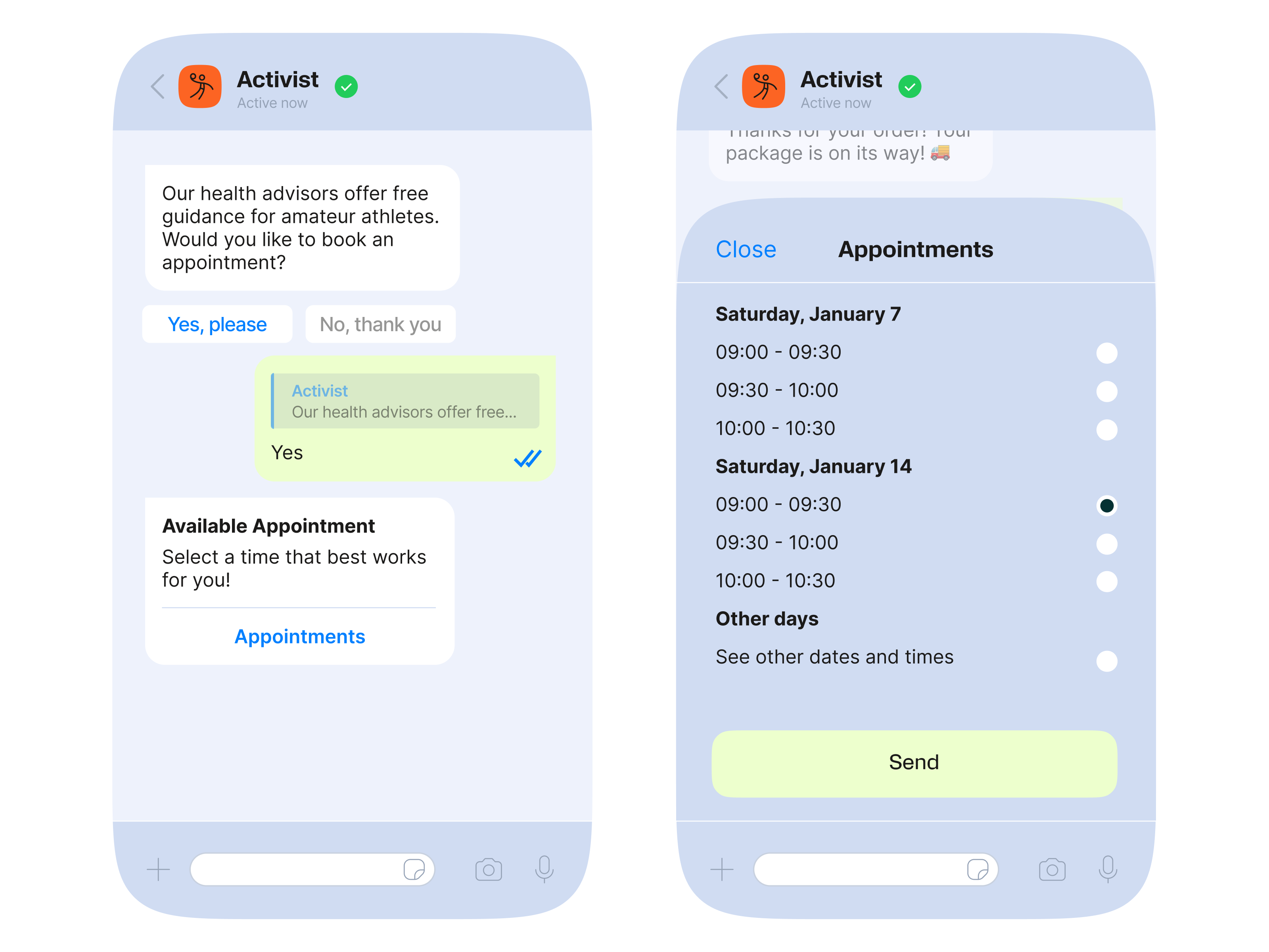 - يرد روبوت الدردشة الآلي بقائمة من الفترات الزمنية المتاحة التي يمكن للعميل الاختيار من بينها
