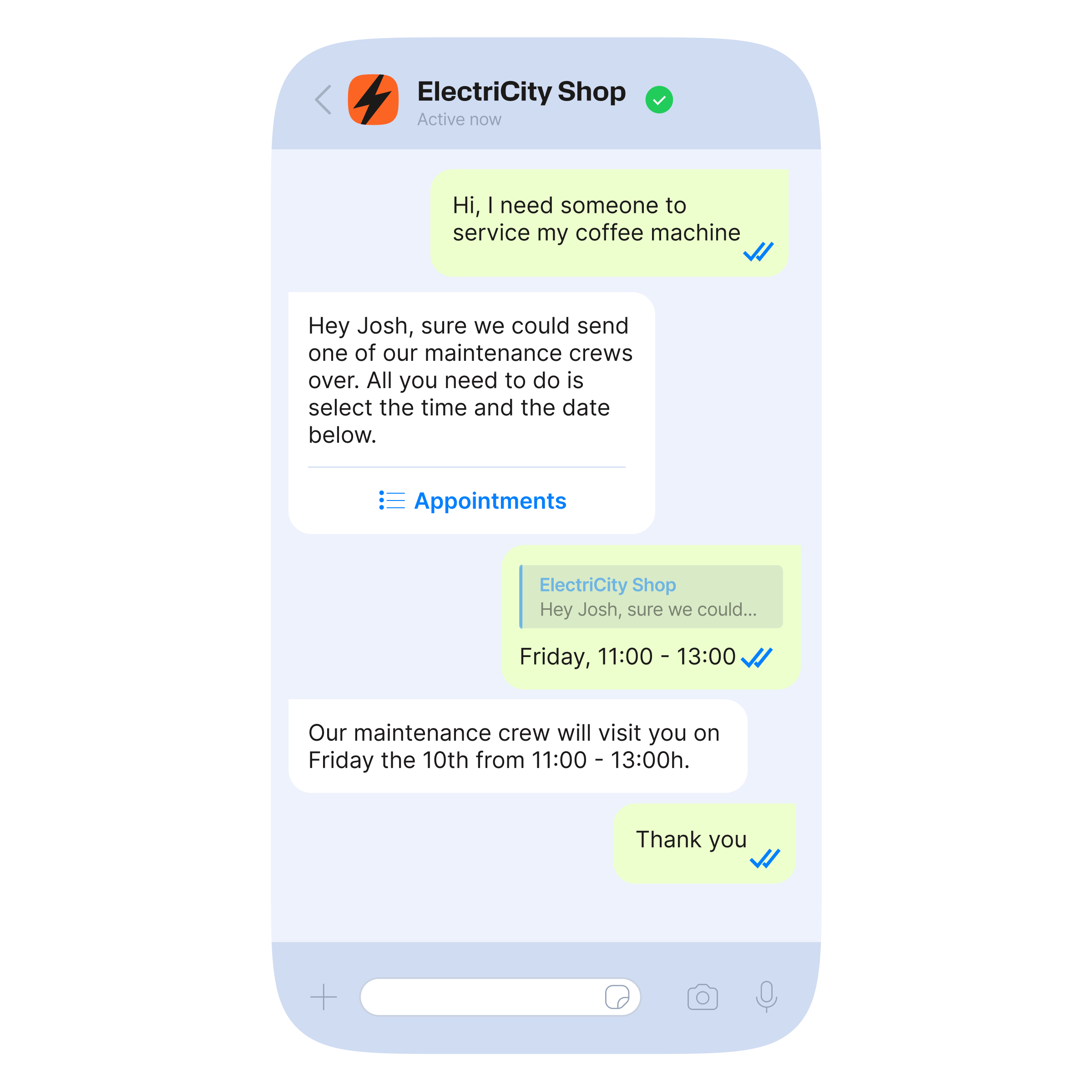 يمكّنك تطبيق واتساب من تزويد العملاء بخيارات الحجز التي تساعدهم على تجنب طوابير المكالمات وتسريع العملية.