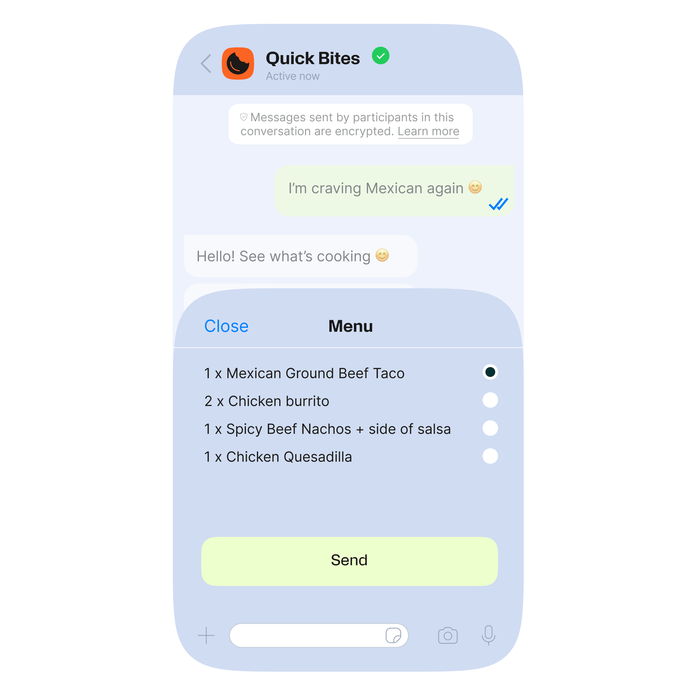 يمكن للعملاء بعد ذلك اختيار عناصر القائمة التي يرغبون في طلبها ببساطة من خلال الرد على رسالتك أو من خلال النقر على زر الحث على اتخاذ إجراء على واتساب
