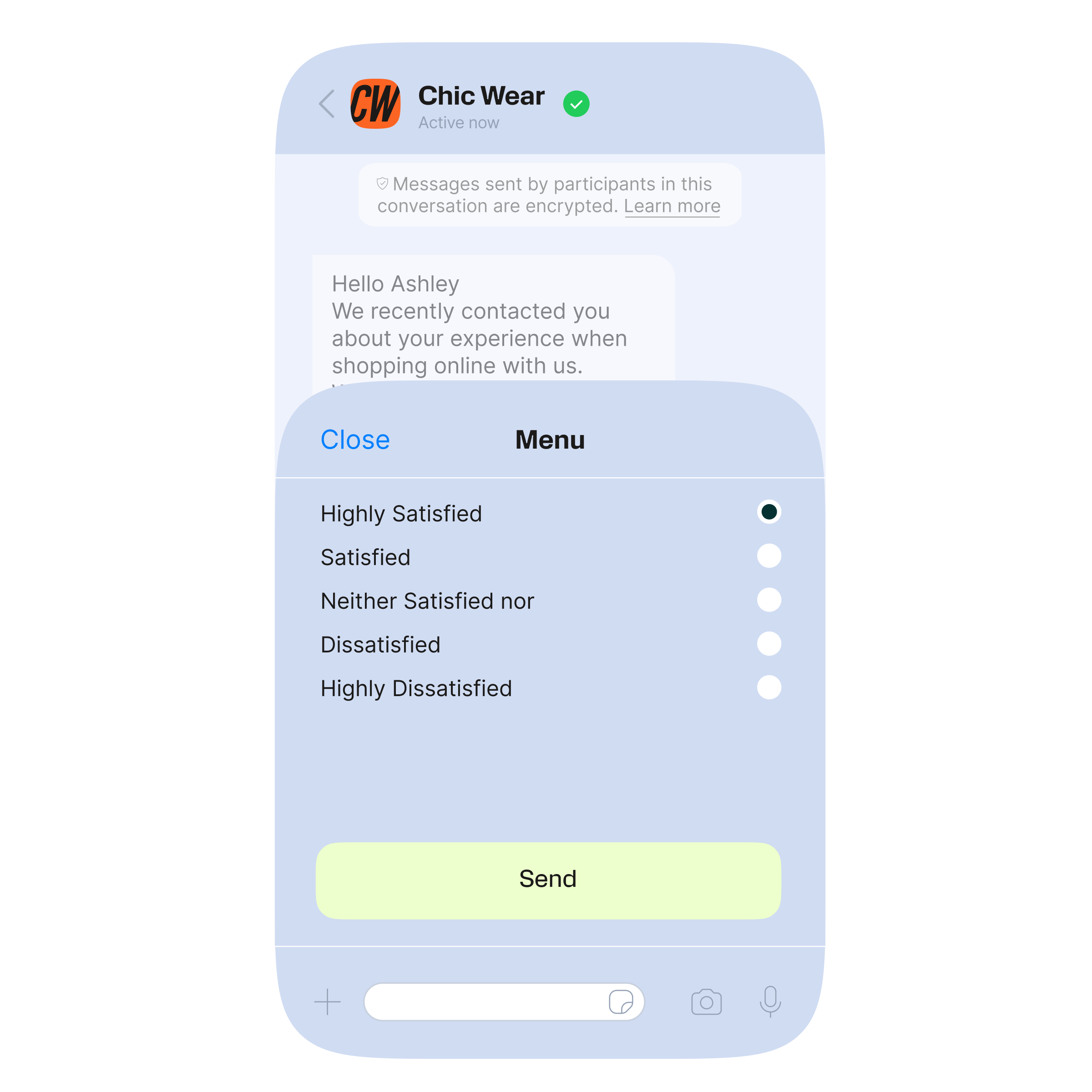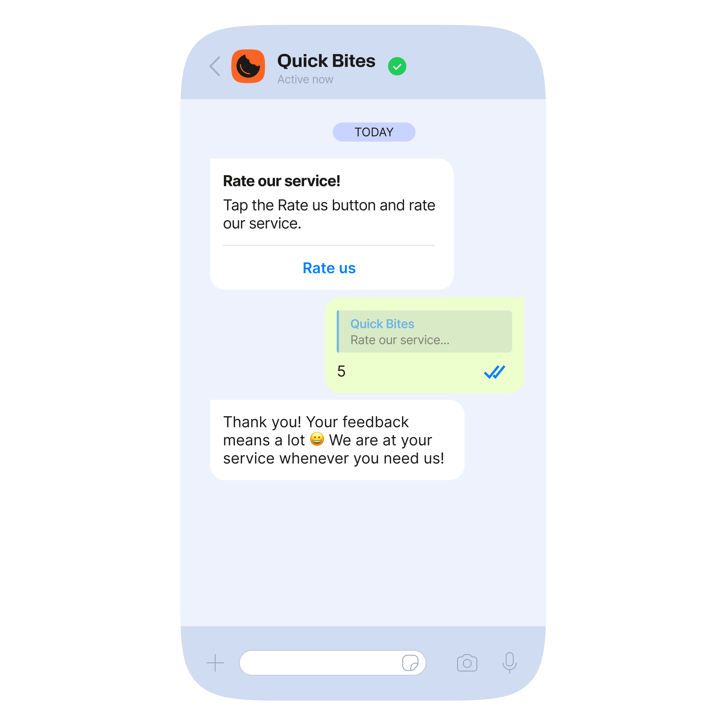 ابدأ برسالة بسيطة لإشراك العميل واسأله عما إذا كان على استعداد لتزويد علامتك التجارية بتعليقاته عبر واتساب. بمجرد أن يؤكد العميل ذلك، استخدم ميزات غنية مثل الأزرار أو رسائل القائمة لتشجيعه على الرد، دون الحاجة إلى كتابة أي إجابات. يمكنك المتابعة لسؤالهم عما إذا كانوا يرغبون في إضافة أي شيء إضافي.
