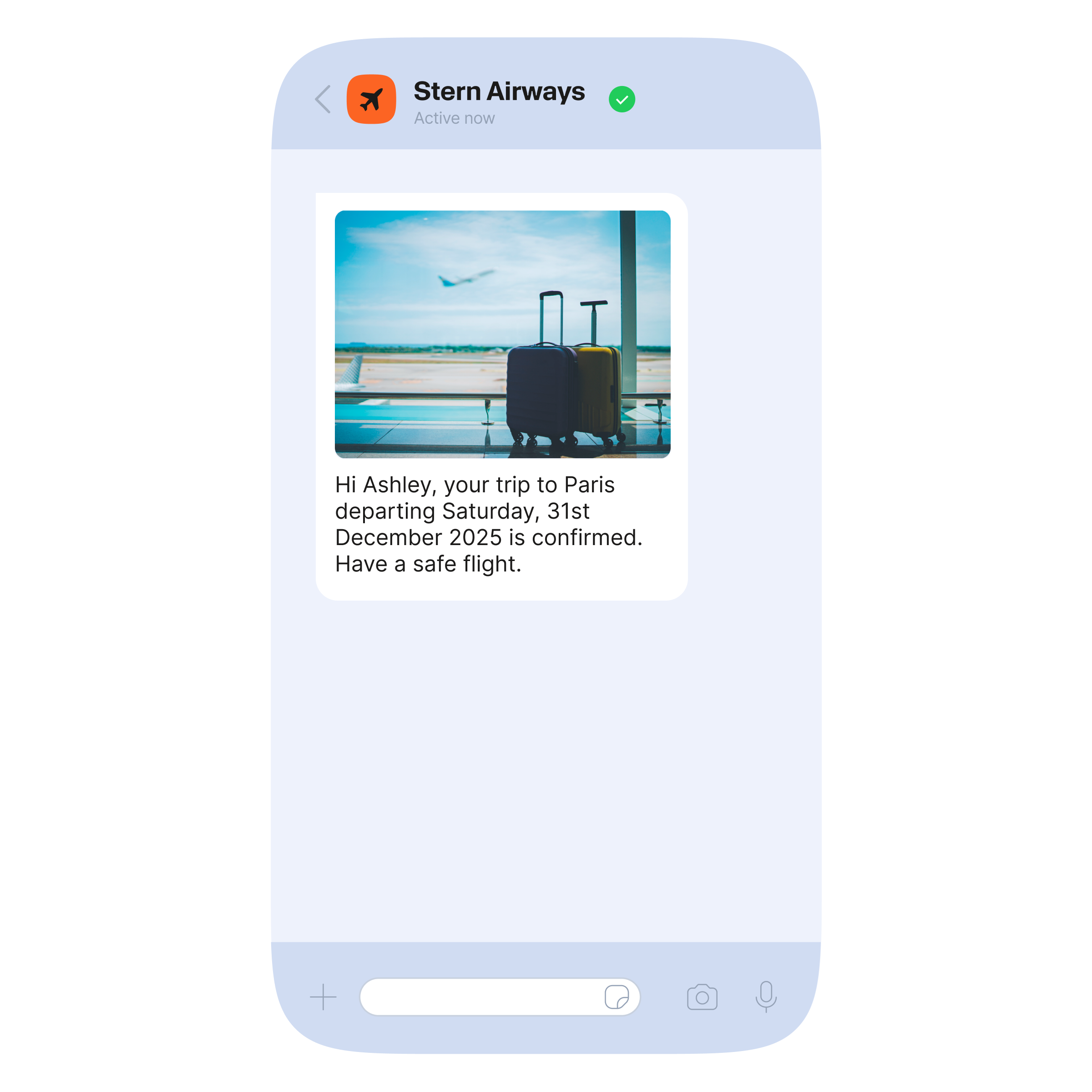 - Pre-trip service and upsell: Send digital check-in, travel checklists, visa and document reminders, and add-on offers like seat upgrades, lounge access, extra baggage, and excursions. Build guided flows for booking changes and upsells, and allow in-chat payments to remove checkout friction before the trip even starts.