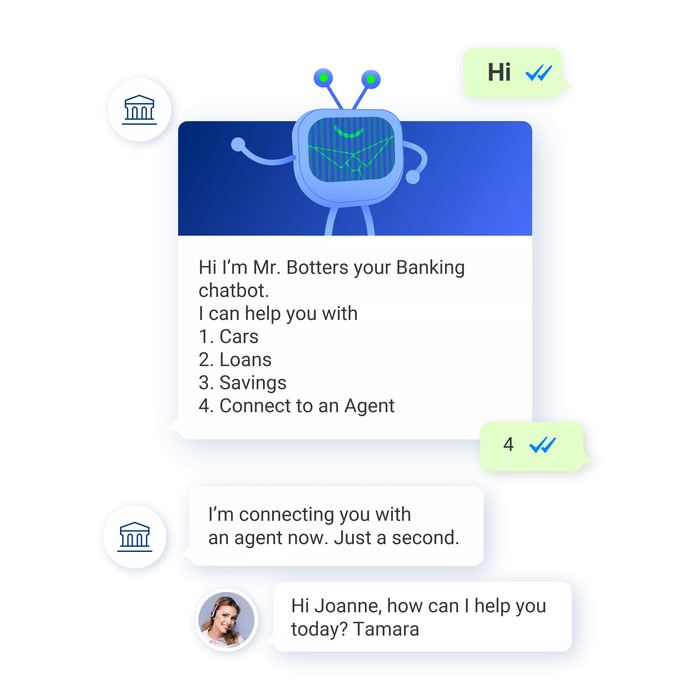 Reduce contact center costs when you use a chatbot over a cost-effective chat app, such as WhatsApp, to offload customer queries from agents.