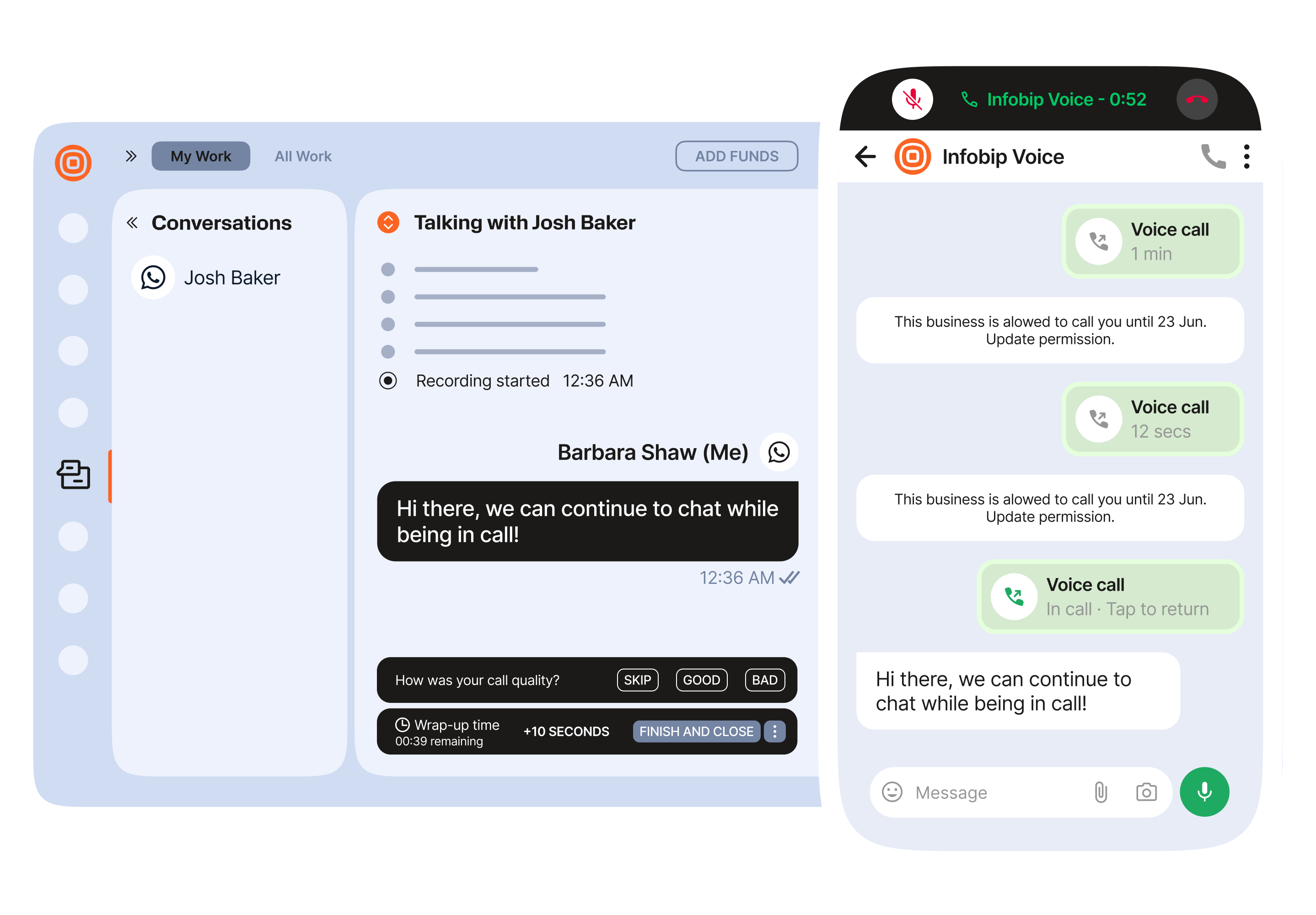 Offer voice and chat simultaneously in WhatsApp, so customers can share details while talking – without missing a beat.