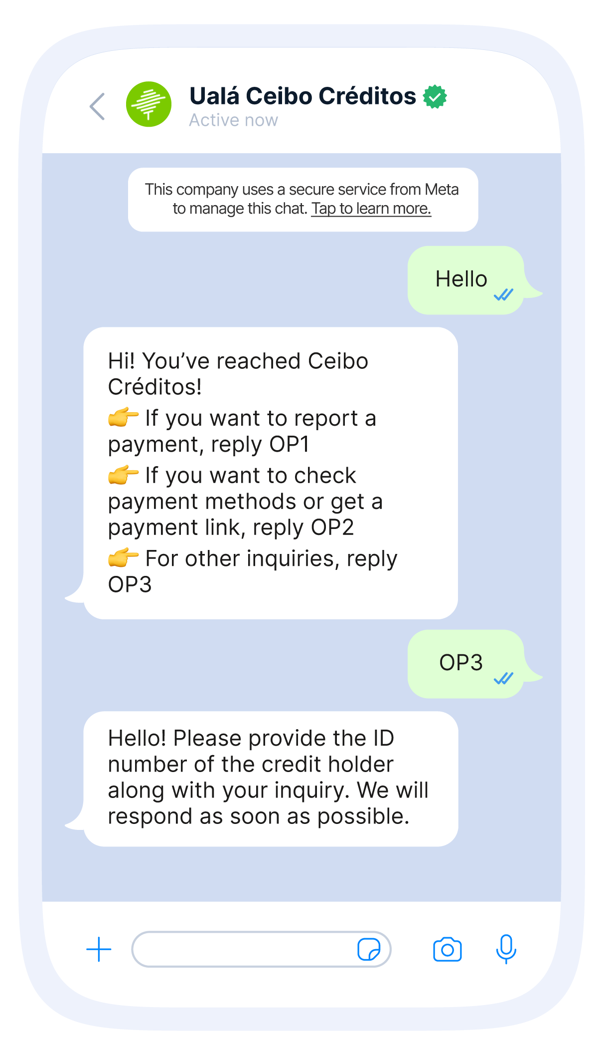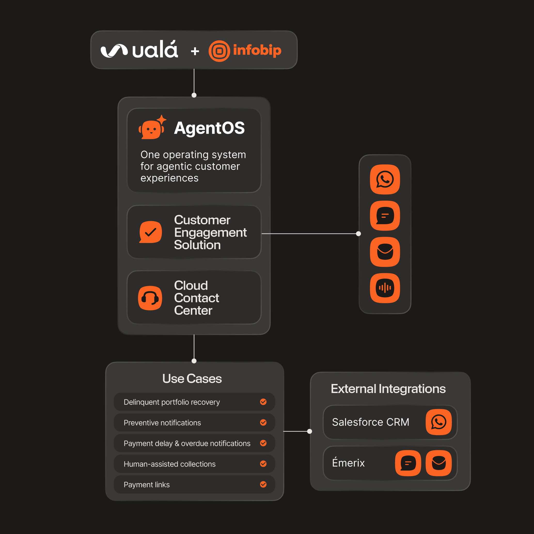All human customer interactions are handled through Infobip’s cloud contact center, ensuring full visibility and control. WhatsApp interactions are integrated with Ualá’s Salesforce CRM, enabling seamless data flow and enriched customer profiles.