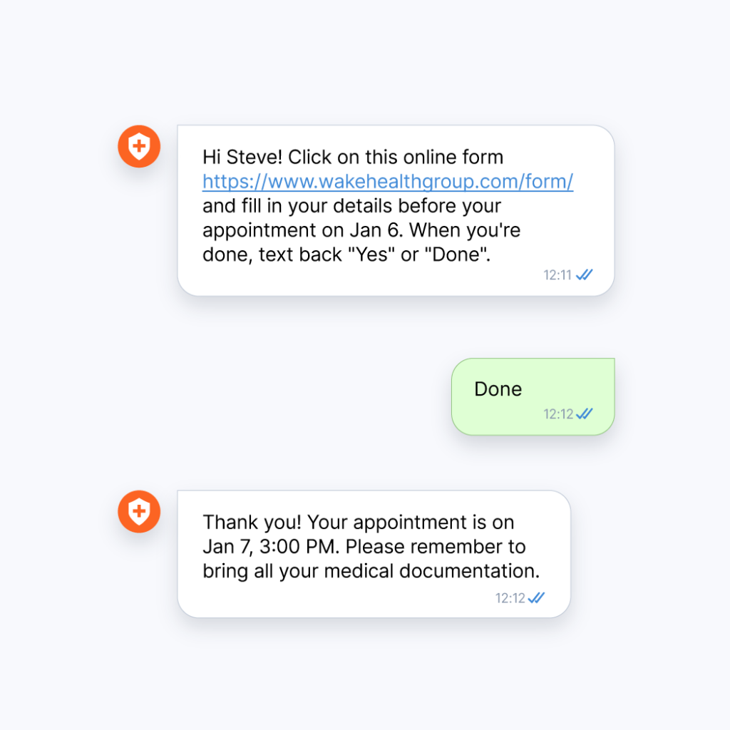 Upon appointment booking, trigger an SMS message to the patient using Infobip’s API, containing the link to the online patient form. Personalize the message with the patient’s name and appointment details.