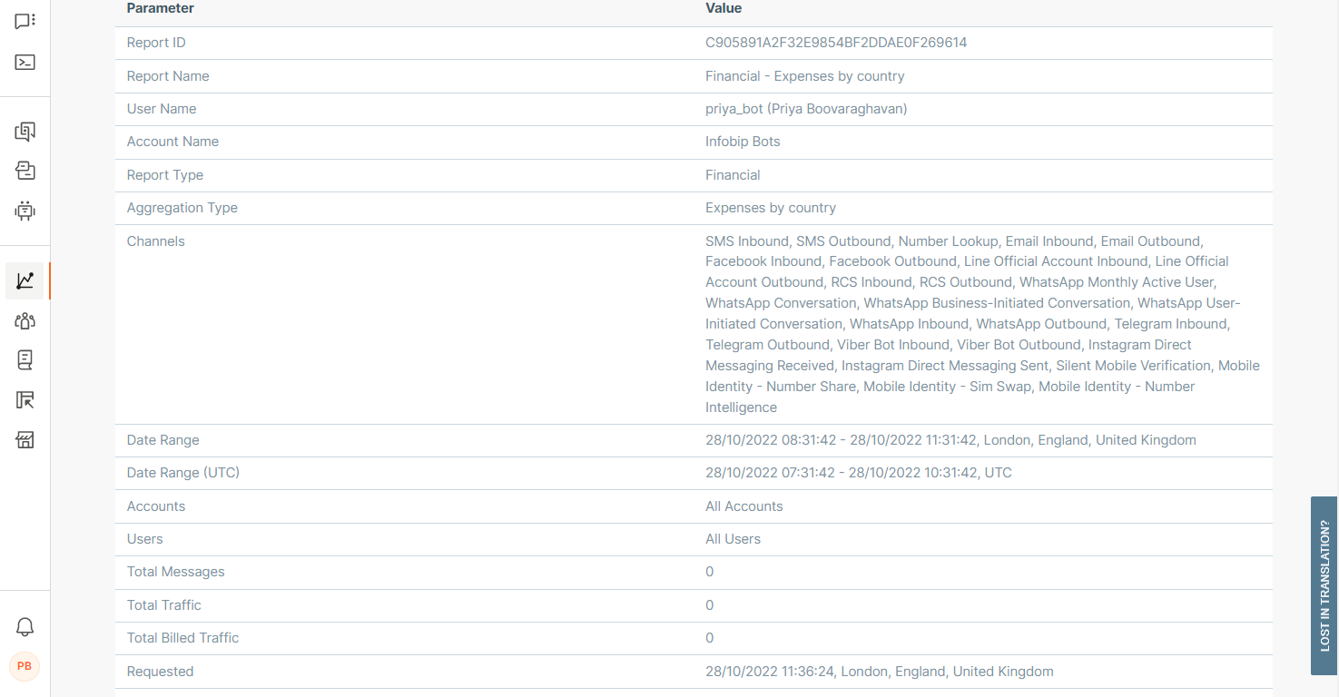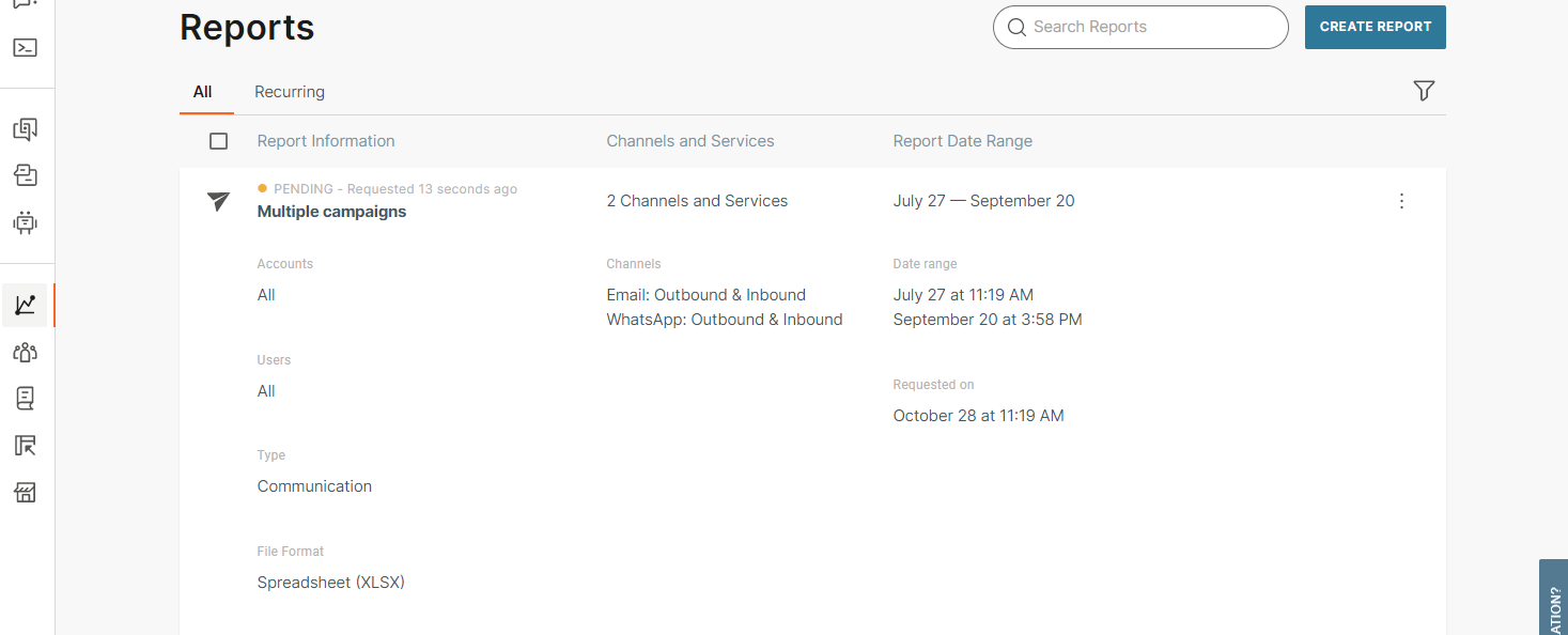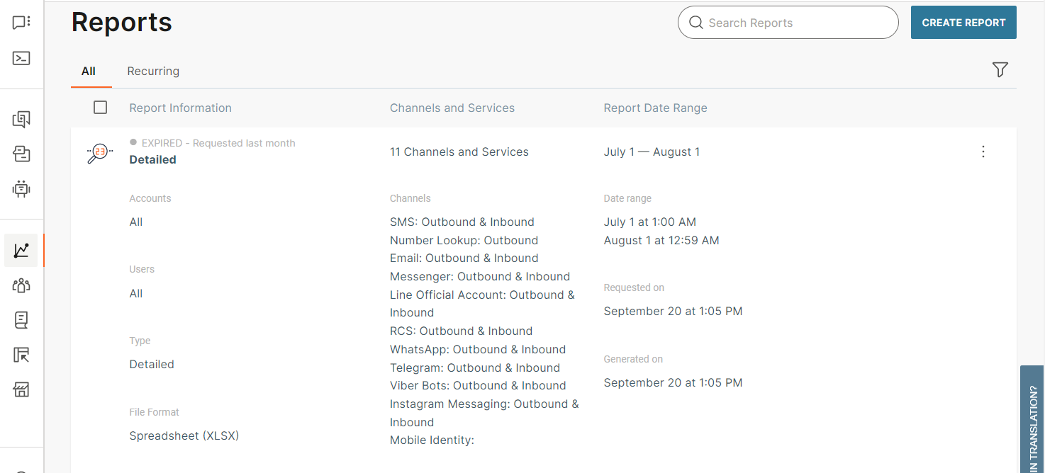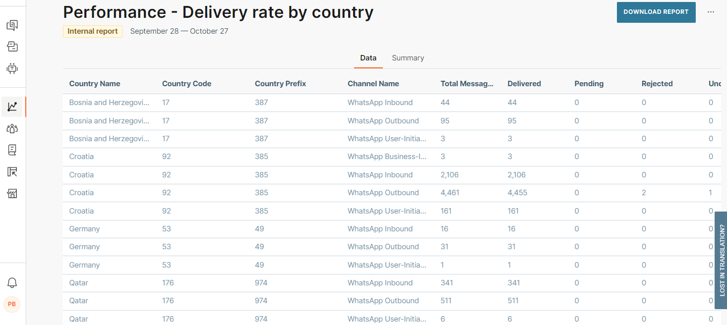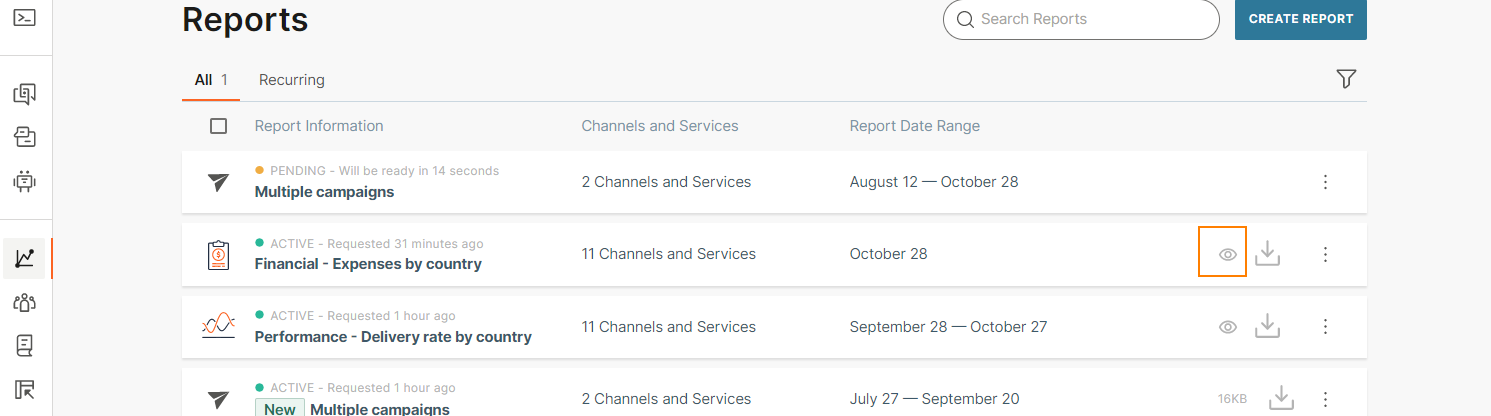 Reports offer a wide range of detailed information, from a list of messages to aggregated statistics. Use filtering and advanced options to obtain information about the quality, performance, and efficiency of your communication with end users. You can also share reports with other people.