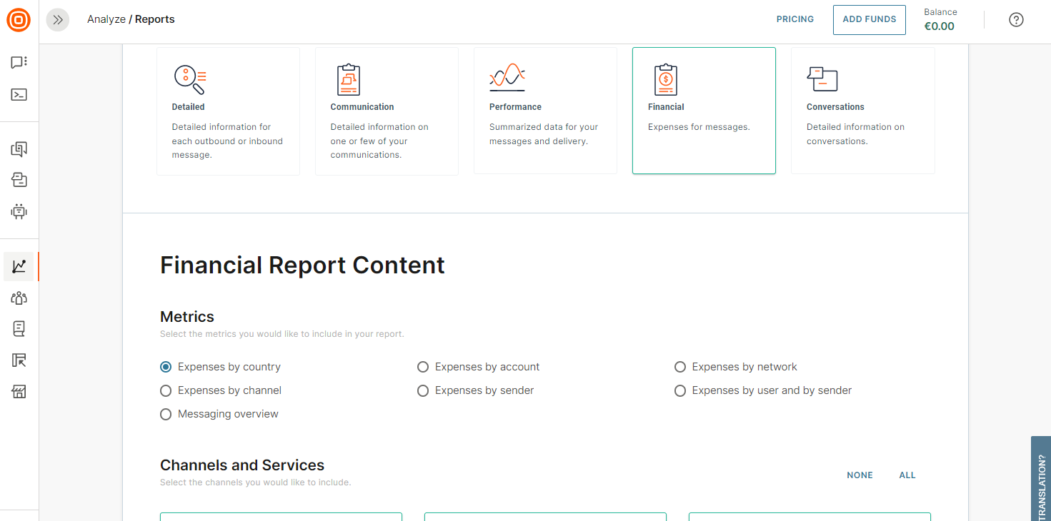 In the Financial Report Content > Metrics section, select the type of expense that you want to track. Example: Expenses by country and Expenses by channel.