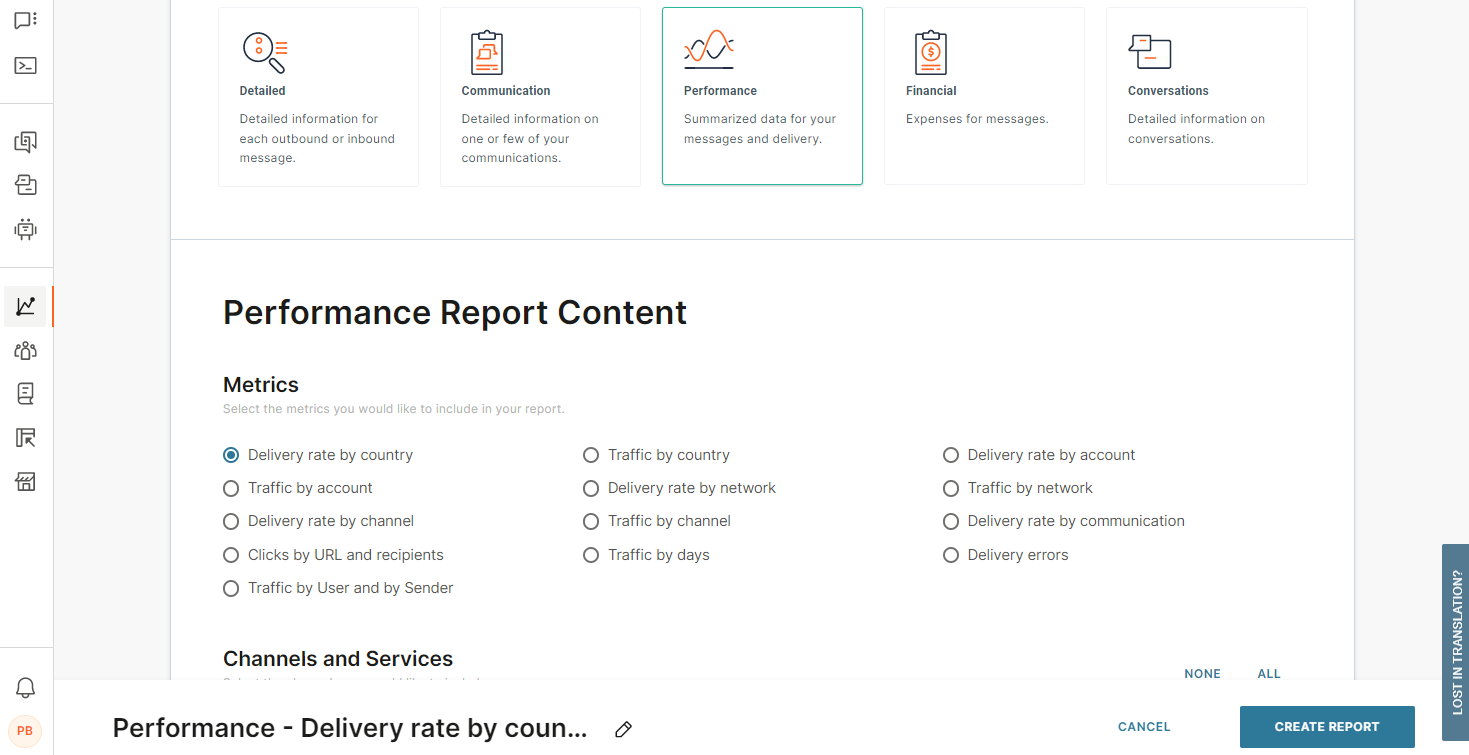 In the Performance Report Content > Metrics section, select the type of performance that you want to track. Example: Delivery rate by country and Traffic by channel.