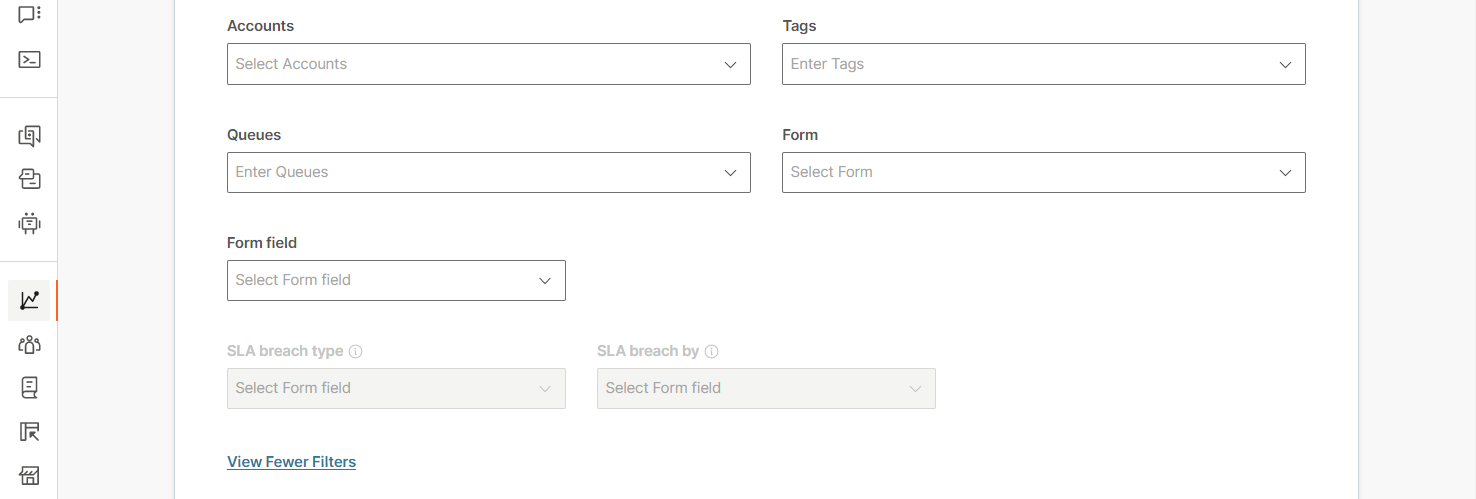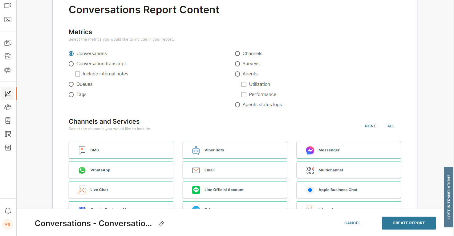 In the Conversations Report Content > Metrics section, select the type of metrics that you want to track. Example: Channels and Surveys.