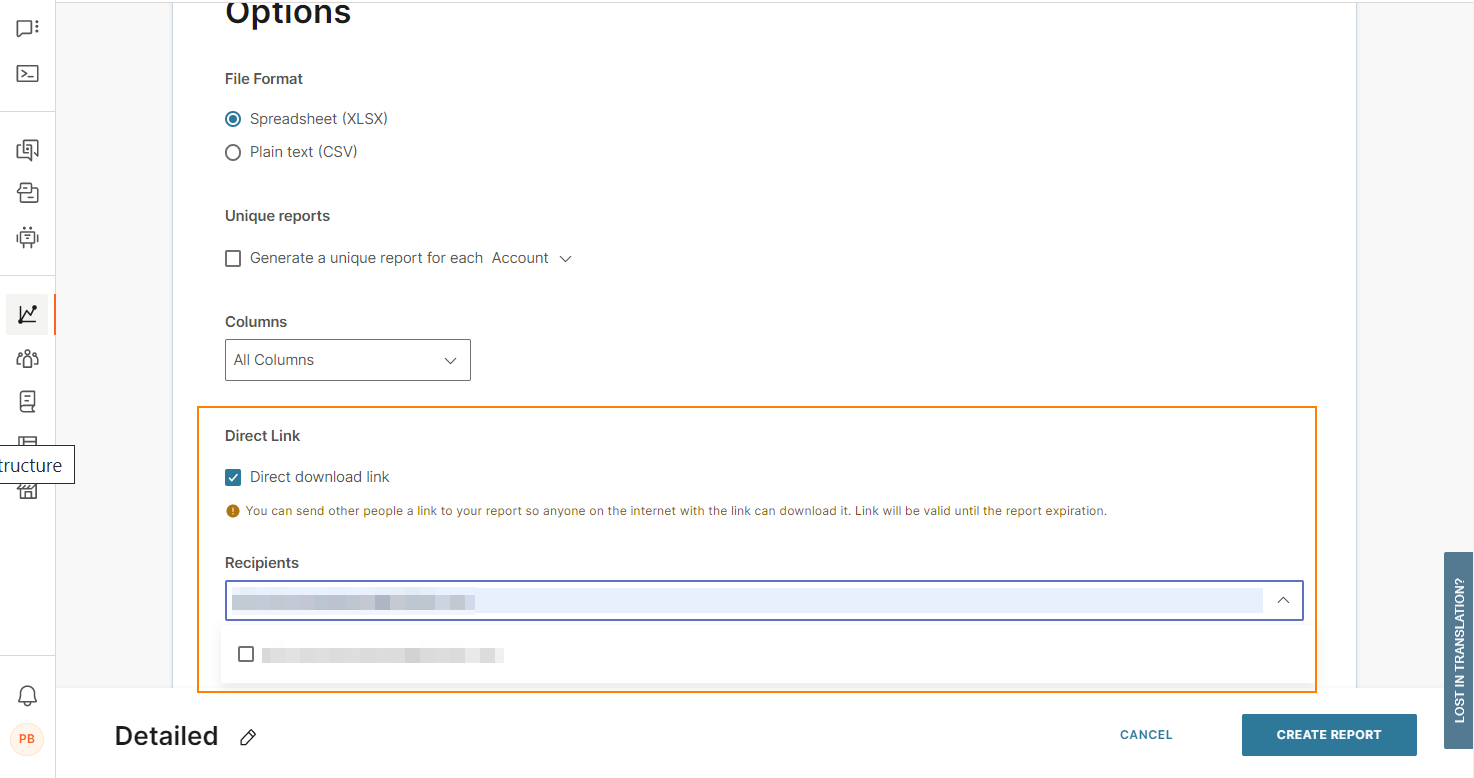 - Direct link: whether you want to share a link to your report. Anyone who has the link can download the report. The link is valid until the report status changes to Expired.