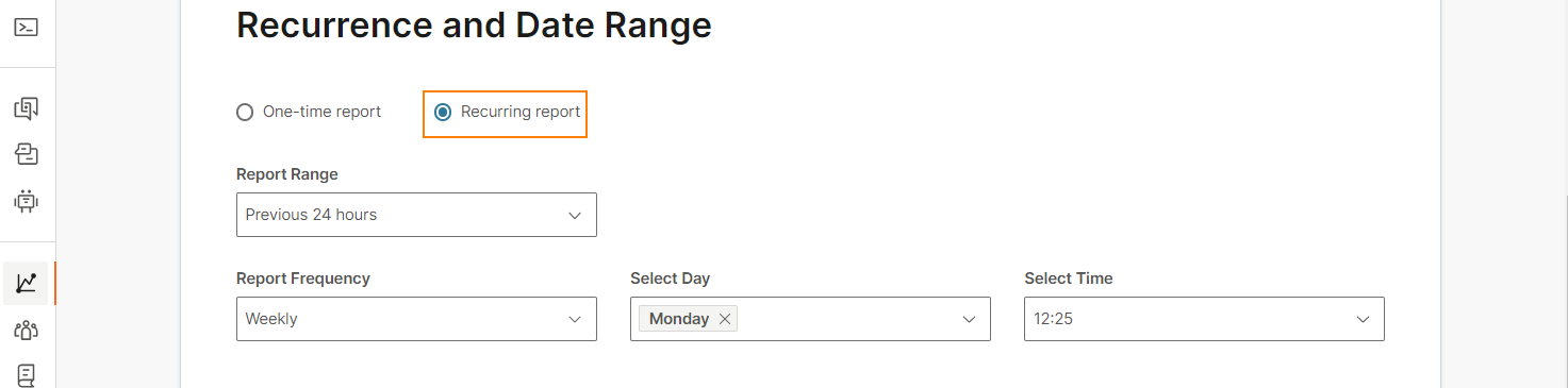 You can avoid manually creating reports from scratch by setting up recurring reports. When creating a report, choose the report range, frequency, and the day and time that you want the reports delivered.