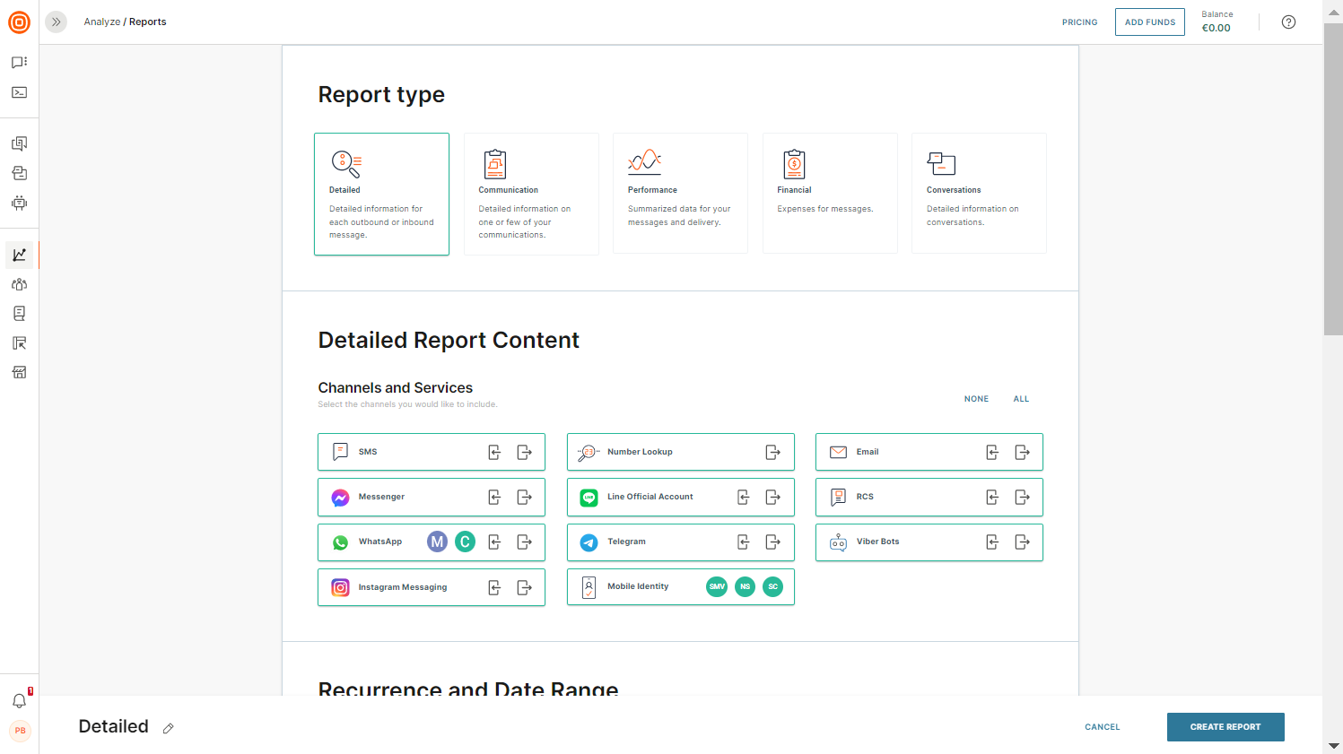 In the Detailed Report Content > Channels and Services section, select the channels that you want to track. By default, all channels are selected. To track a specific channel, deselect the ones you do not need. You can also use the None and All options to select channels.
