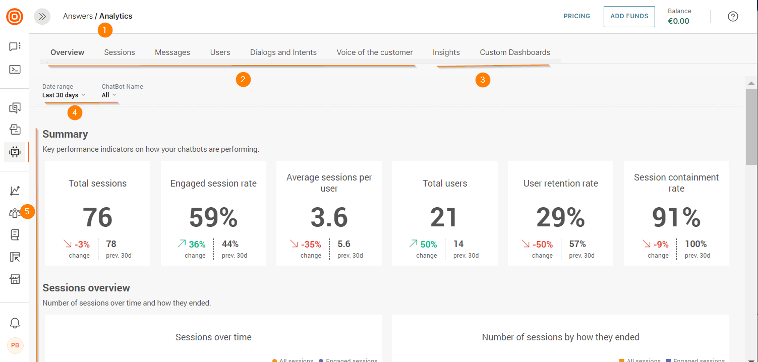 - Predefined dashboards - Set of predefined chatbot dashboards which come with Answers. Flick between the tabs for the various views