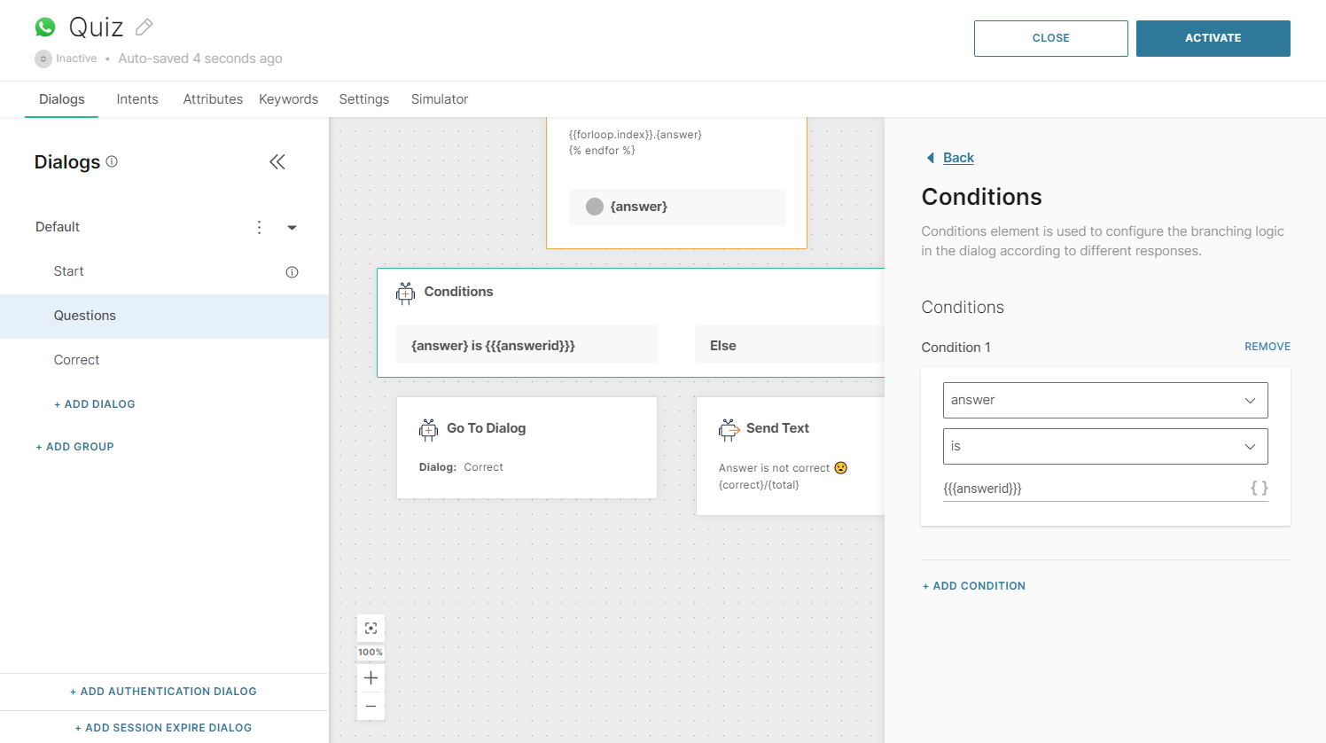 Use templating language in all fields in which you can enter text and variables, in Answers elements. Example: Text fields in Text element and List element.
