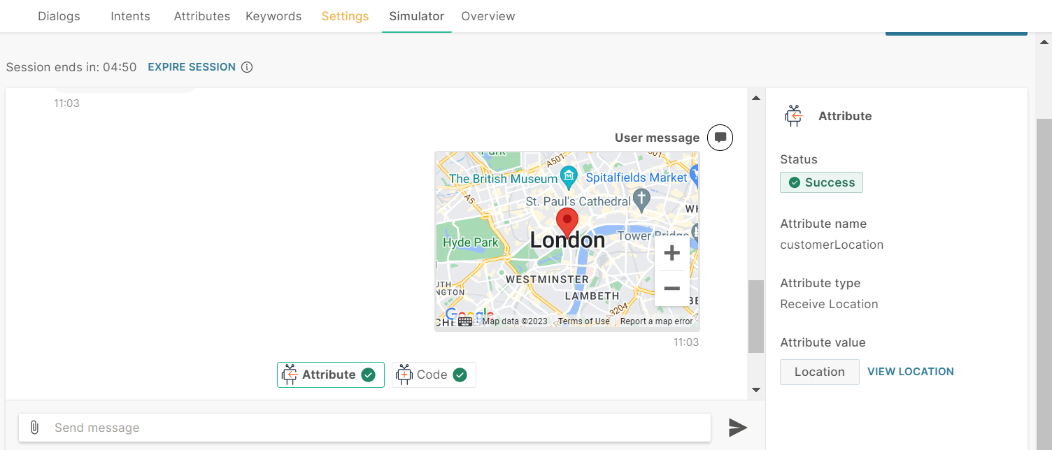 The simulation automatically stops 5 minutes after you start it. The session duration of the simulator does not depend on the chatbot session timeout.