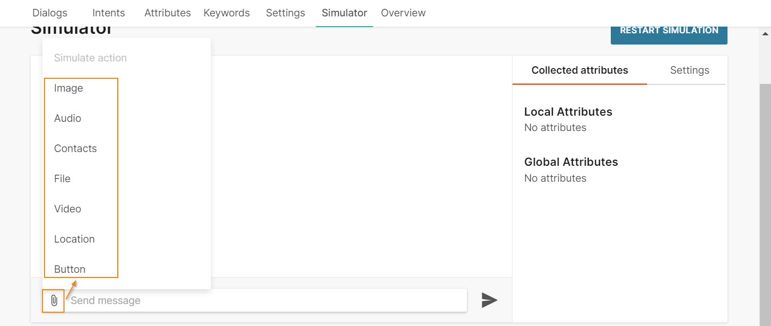 Simulate receiving files from end users. In the message box, choose the type of file that you expect the end user to send during the conversation.
