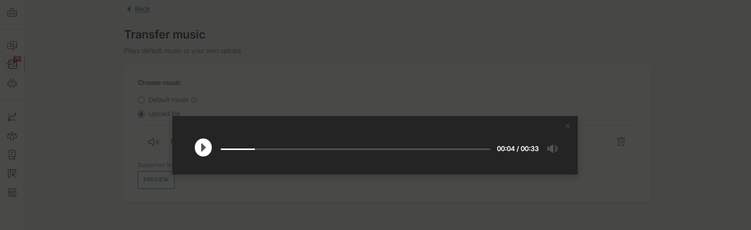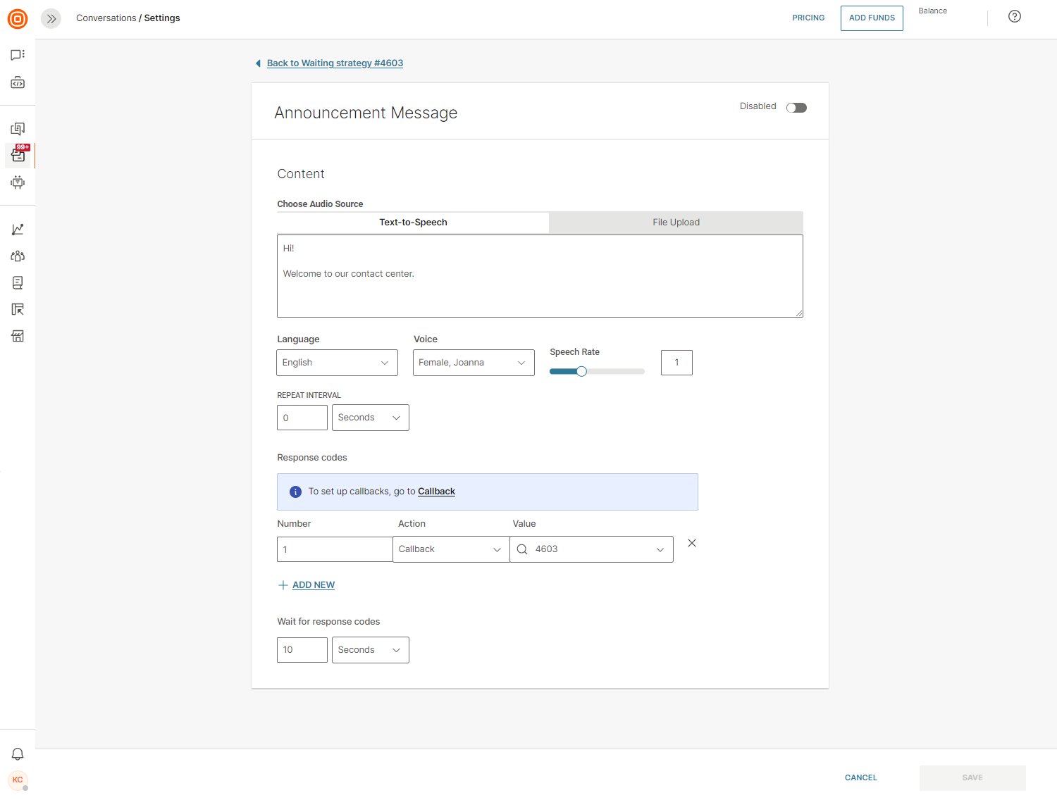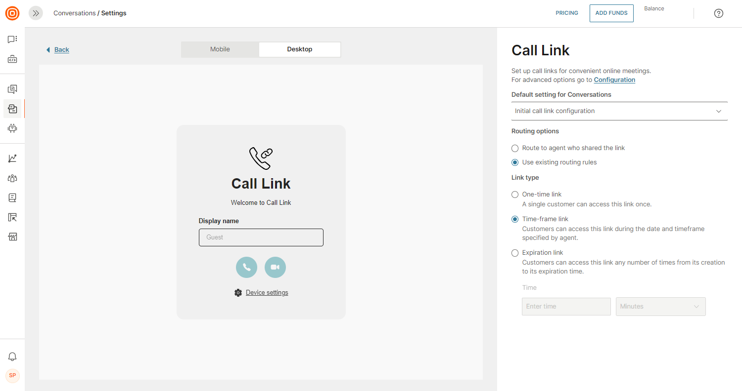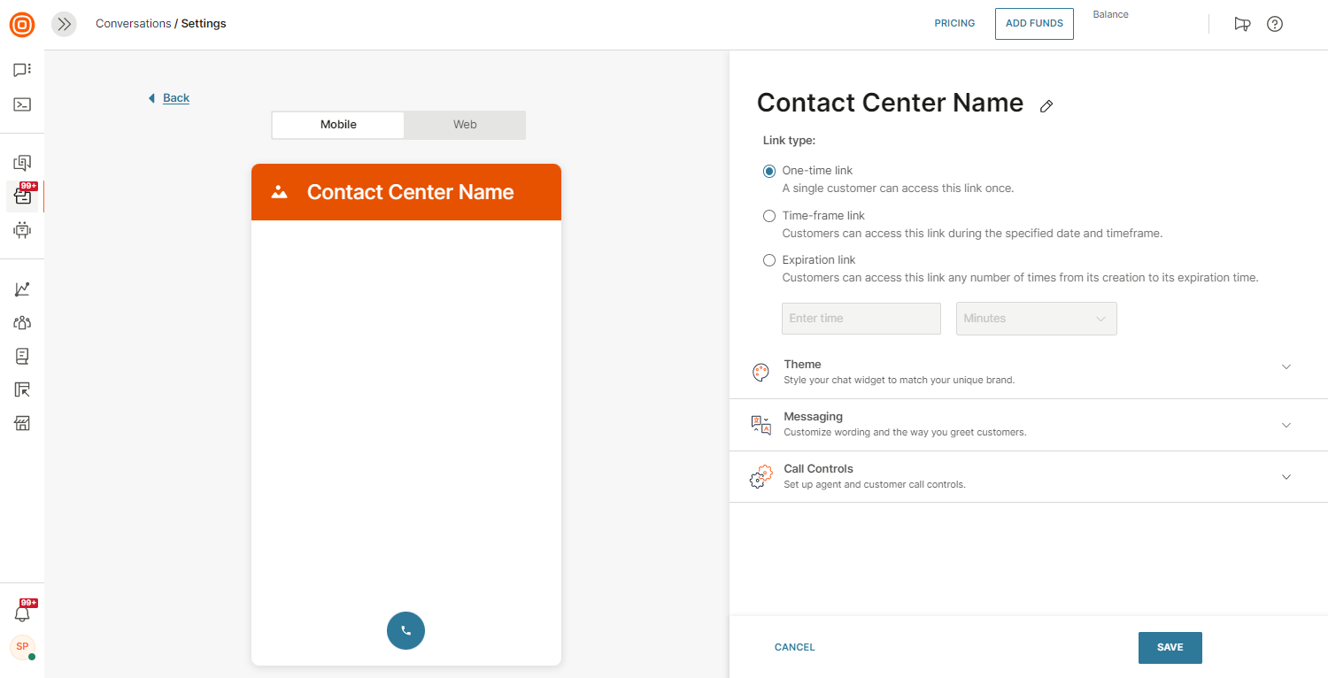 - In the pop-up, enter the message text and the call button label that will be shown to the customer.