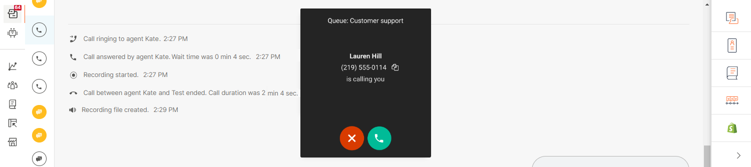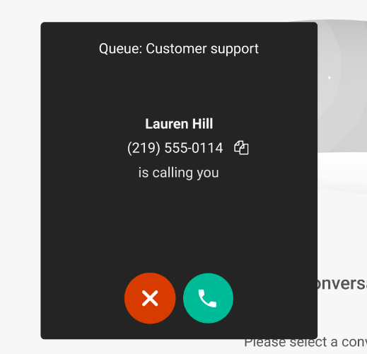 The pop-up window allows you to answer or decline the call. It also provides key information that may be the first insight you have about the customer before answering. This includes: