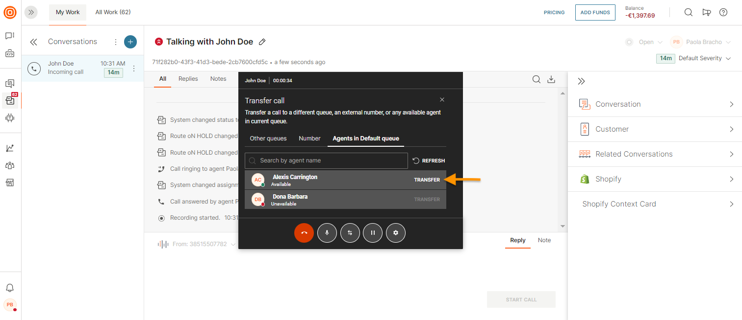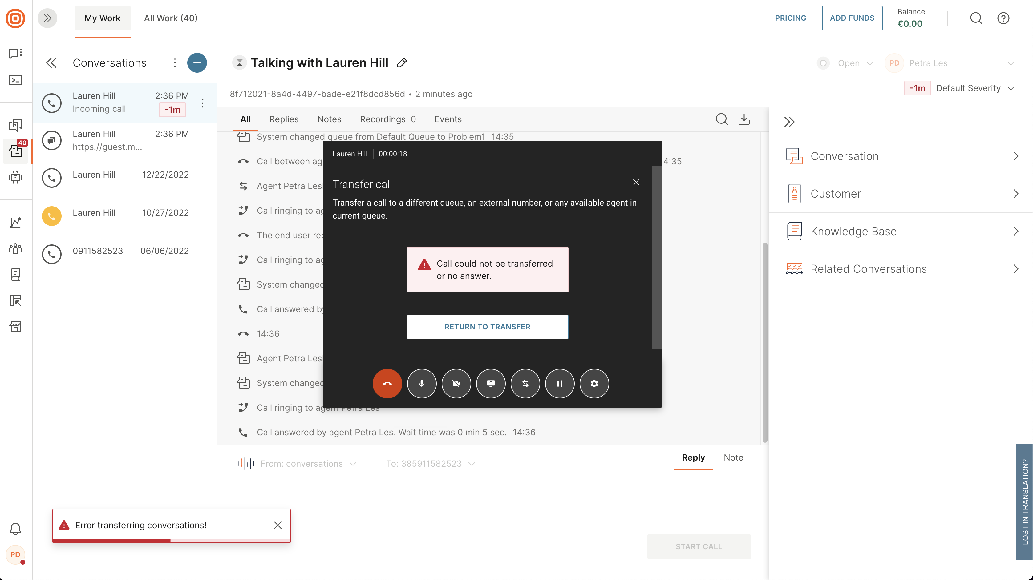 If a call request has already been made, you will see a warning when trying to create a new conversation. Additionally, if a conversation with the customer already exists, you will see a note with a link to open the existing conversation and continue from there.