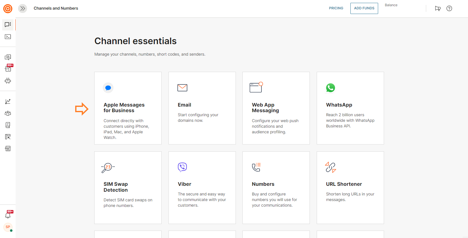 - Once logged into the Infobip web interface, go to Channels and Numbers → Channels and select Apple Messages for Business for further steps.