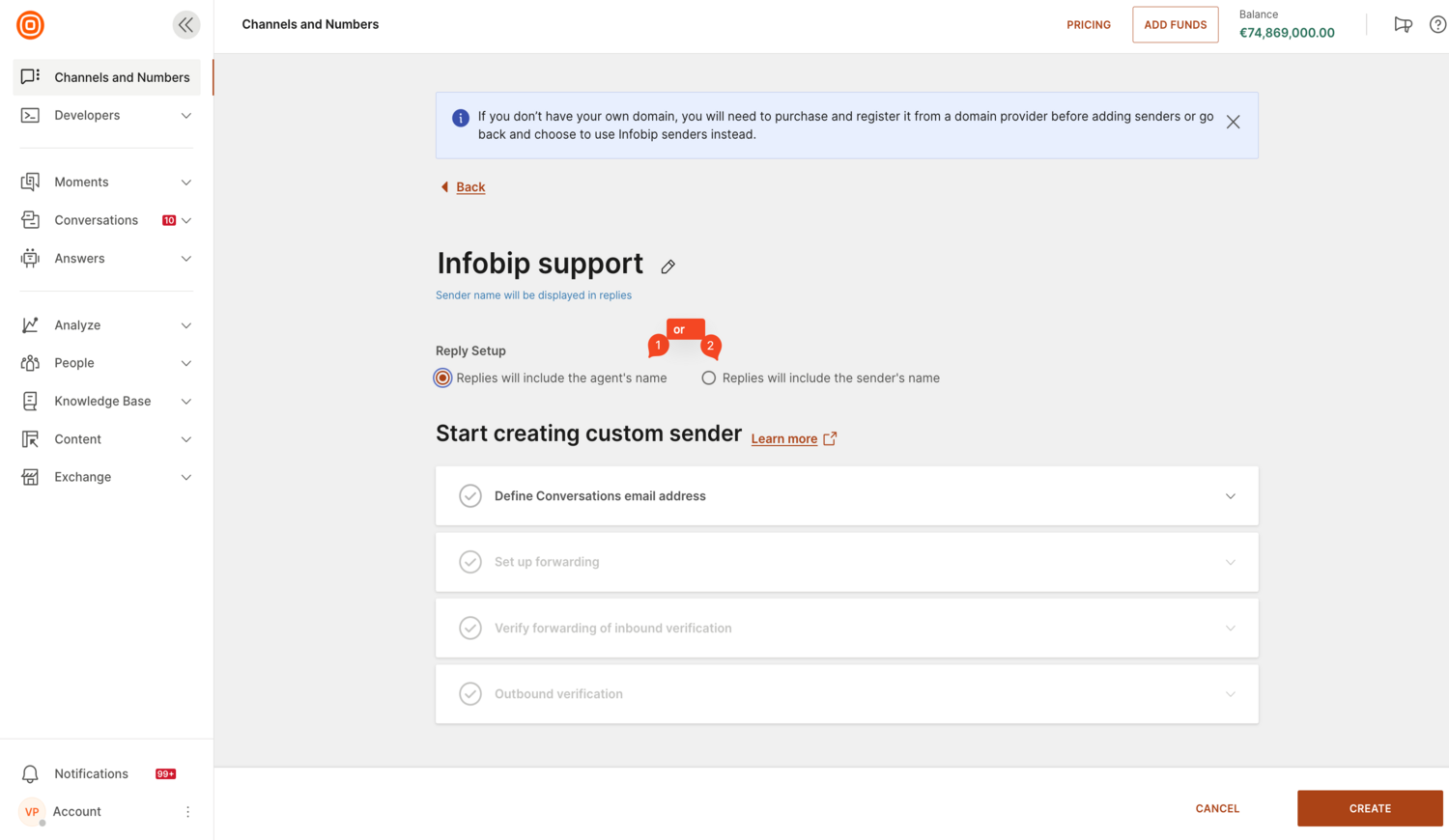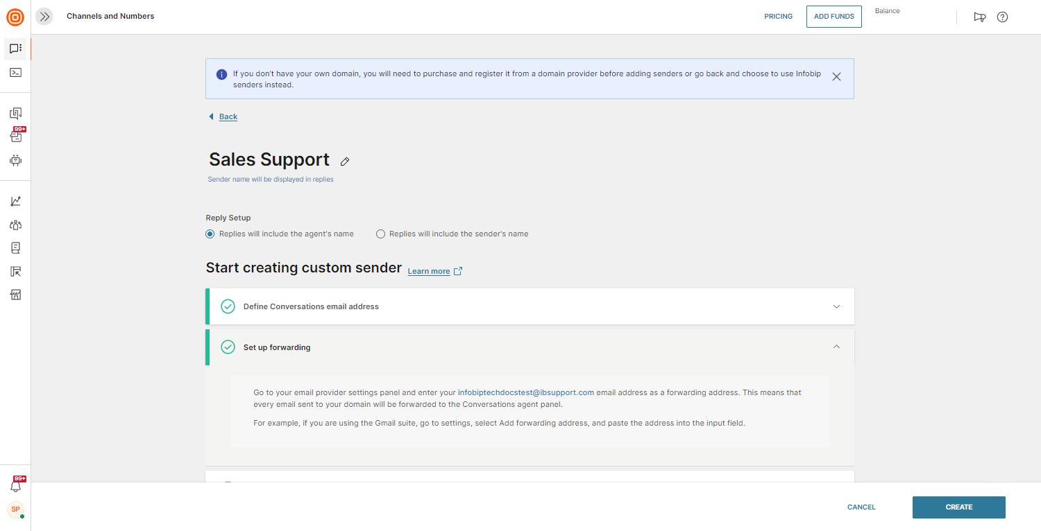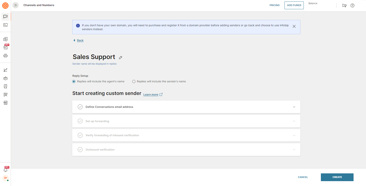 - Configure the Open Channel sender - Contact your Infobip account manager or the Support team to set up an Open Channel sender in the Infobip web interface. This sender acts as a bridge between Infobip Conversations and your external messaging platform.