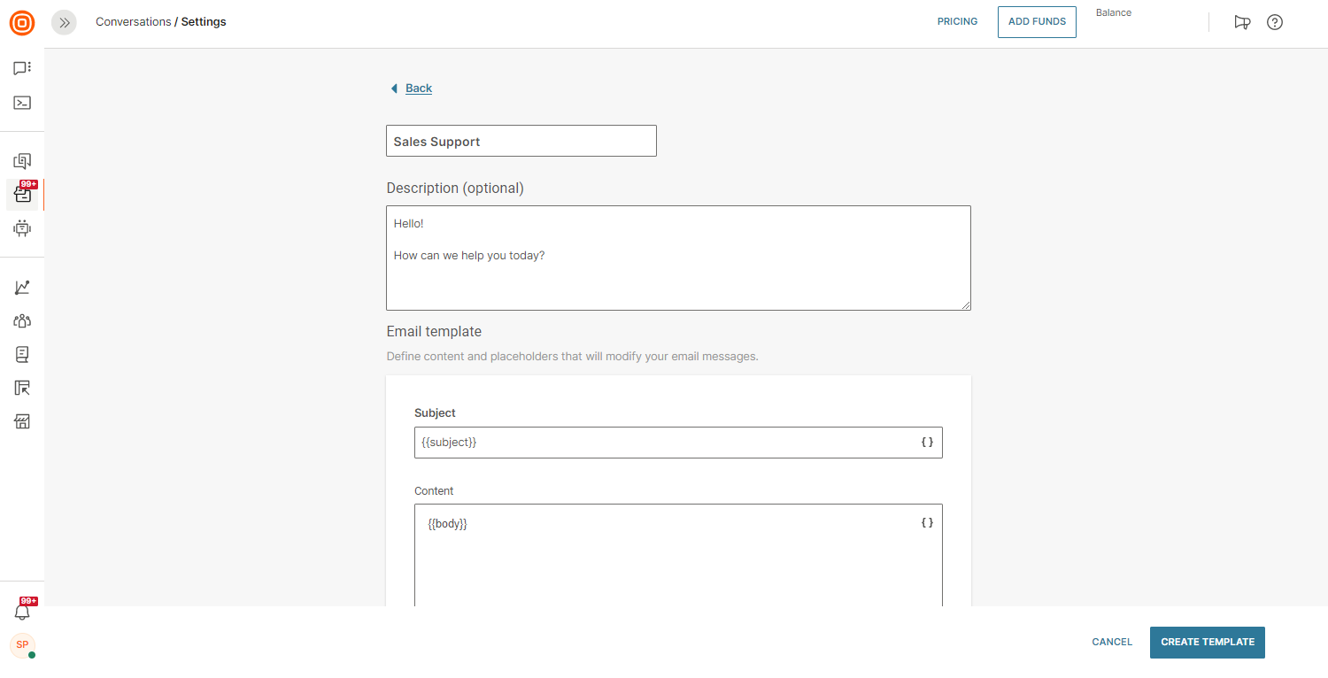 - To create and manage multiple templates, go to Conversations → Settings → Channels → Email → Templates.