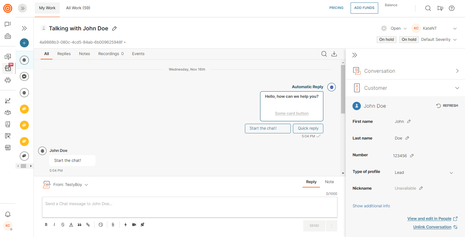 - Copy the Conversation ID of the conversation you want to merge with the main one. Keep in mind that you need to copy the conversation ID from the Conversation context card, not the Short ID.