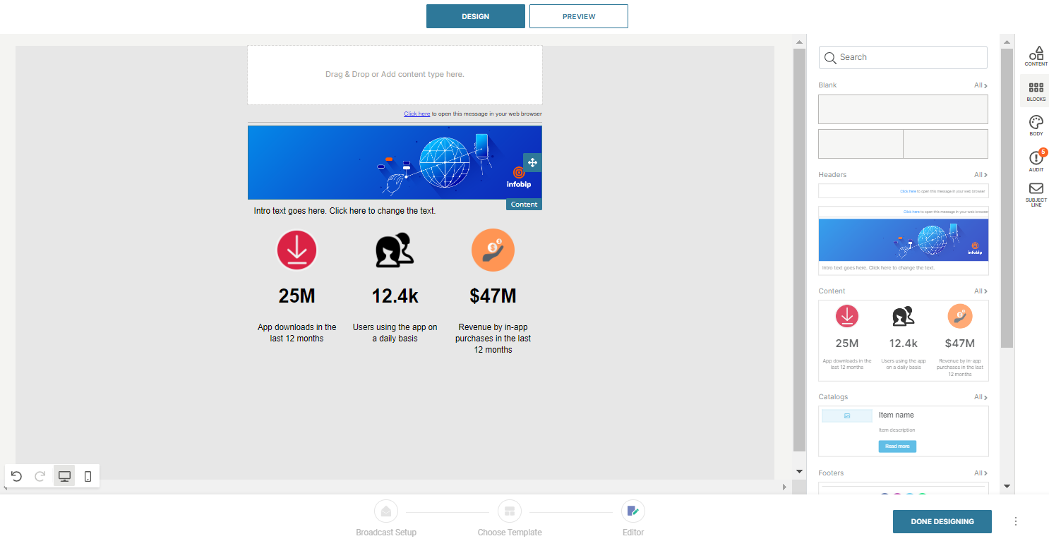 - Blocks: Structure your email with layout blocks.