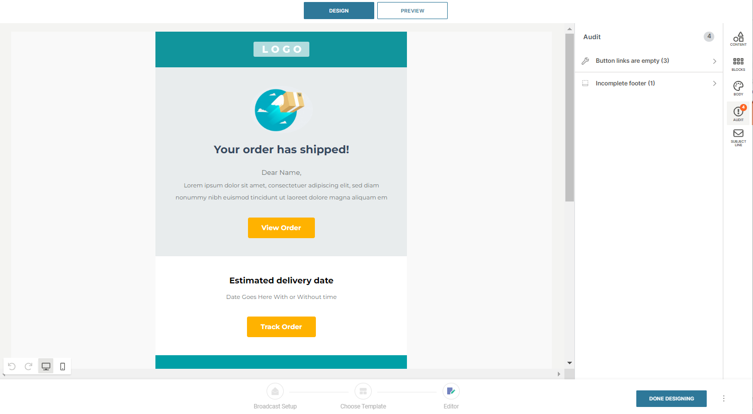 - Body: Adjust overall email settings and styles.