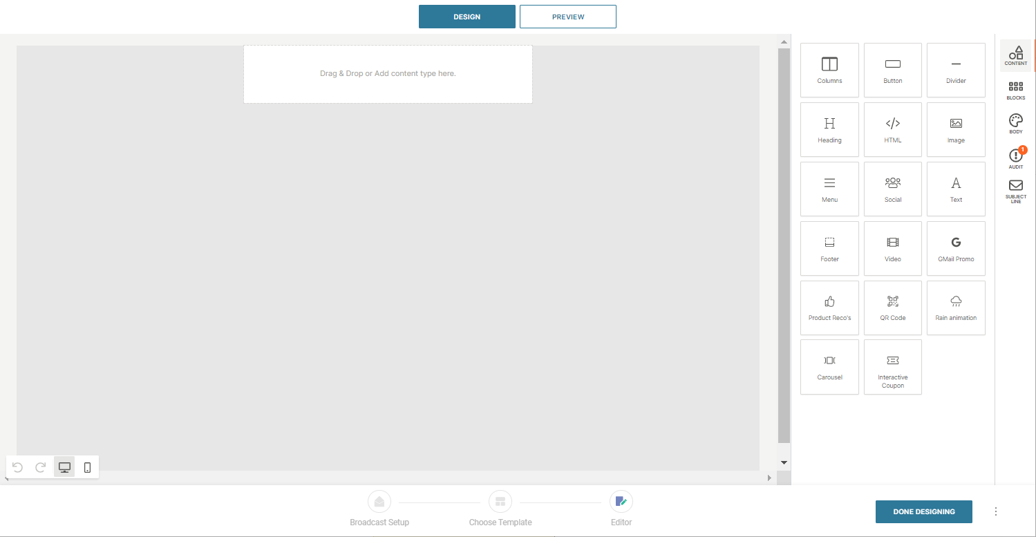 The Email editor is a responsive, drag-and-drop tool for building professional emails without coding. Use the editor to design messages optimized for both desktop and mobile, format and personalize text, add images, buttons, and links, and enable tracking. You can start from scratch, upload an HTML file, or reuse saved templates.