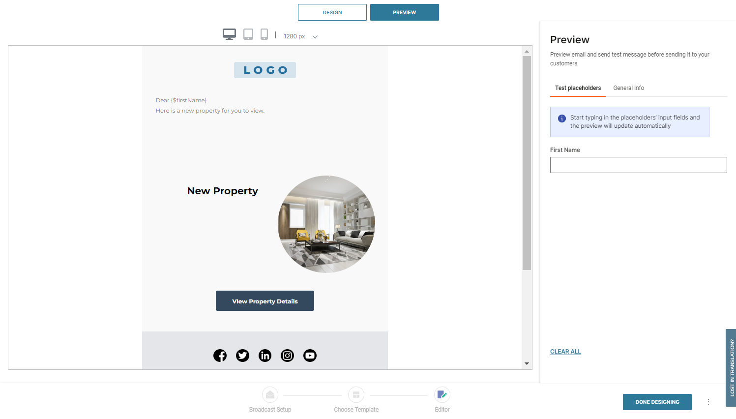 The editor includes a side panel with tabs that give you full control over layout, style, compliance, and personalization: