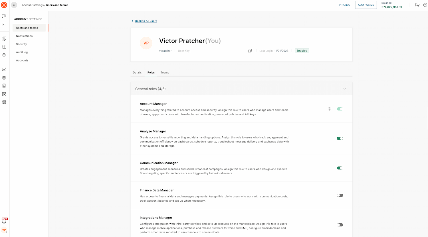 Roles define what users can view or manage within the Infobip web interface. Assign roles to ensure users have access only to the areas relevant to their responsibilities.