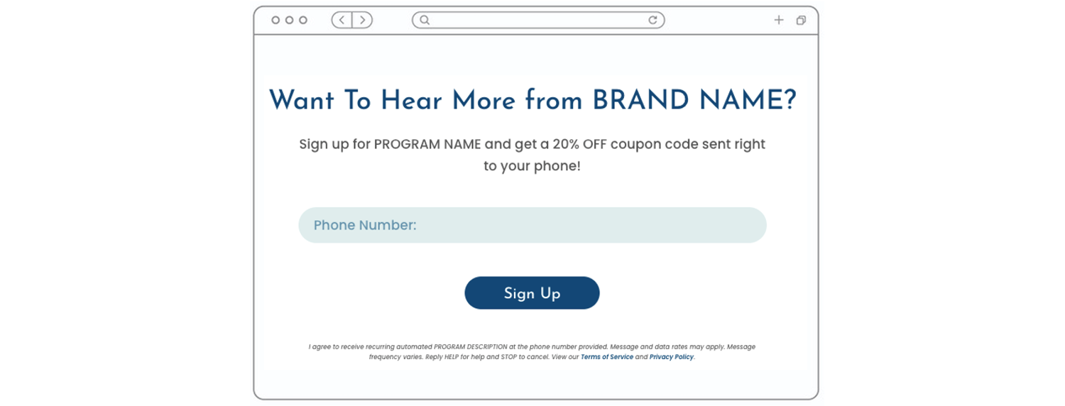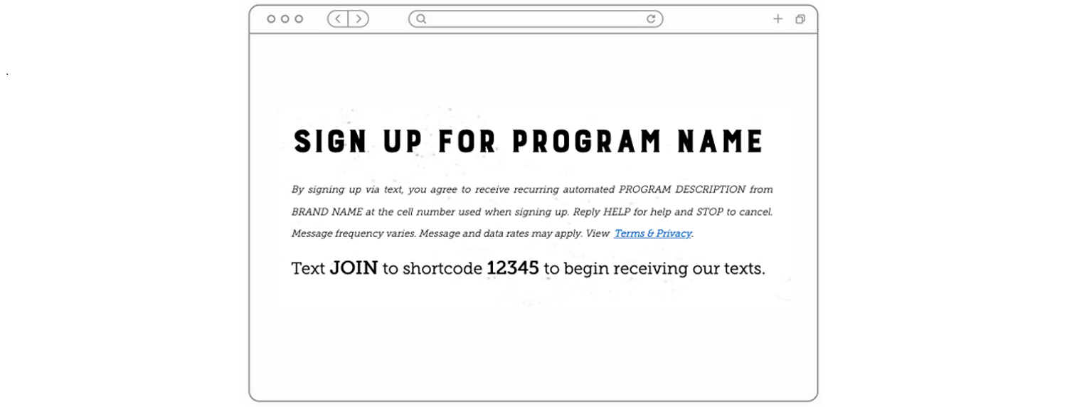 The purpose of a call-to-action (CTA) is to ensure the consumer consents to receive text messages and understands the nature of the program. The CTA language must encourage or invite a consumer to opt into a messaging program and must be clearly and unambiguously displayed with the following disclosures: