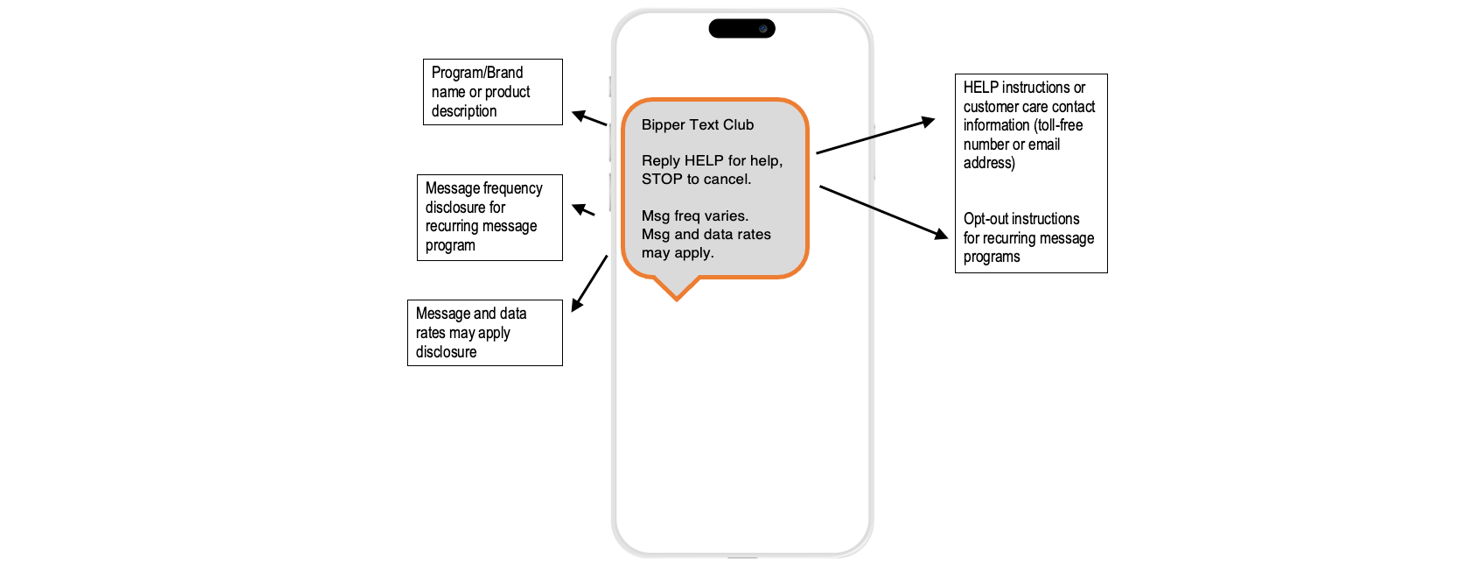 Additionally, opt-in messages must contain the program (brand) name or product description, customer care contact information, message frequency disclosure, “message and data rates may apply” disclosure (non-FTEU), and opt-out instructions (reply STOP to opt-out).