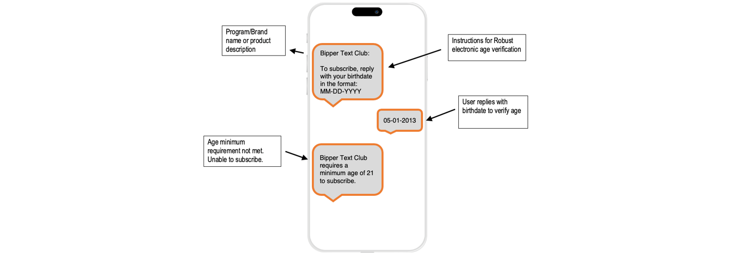 Asking a user to reply “YES/AGREE” to confirm they are over a certain age is not considered a robust age verification.