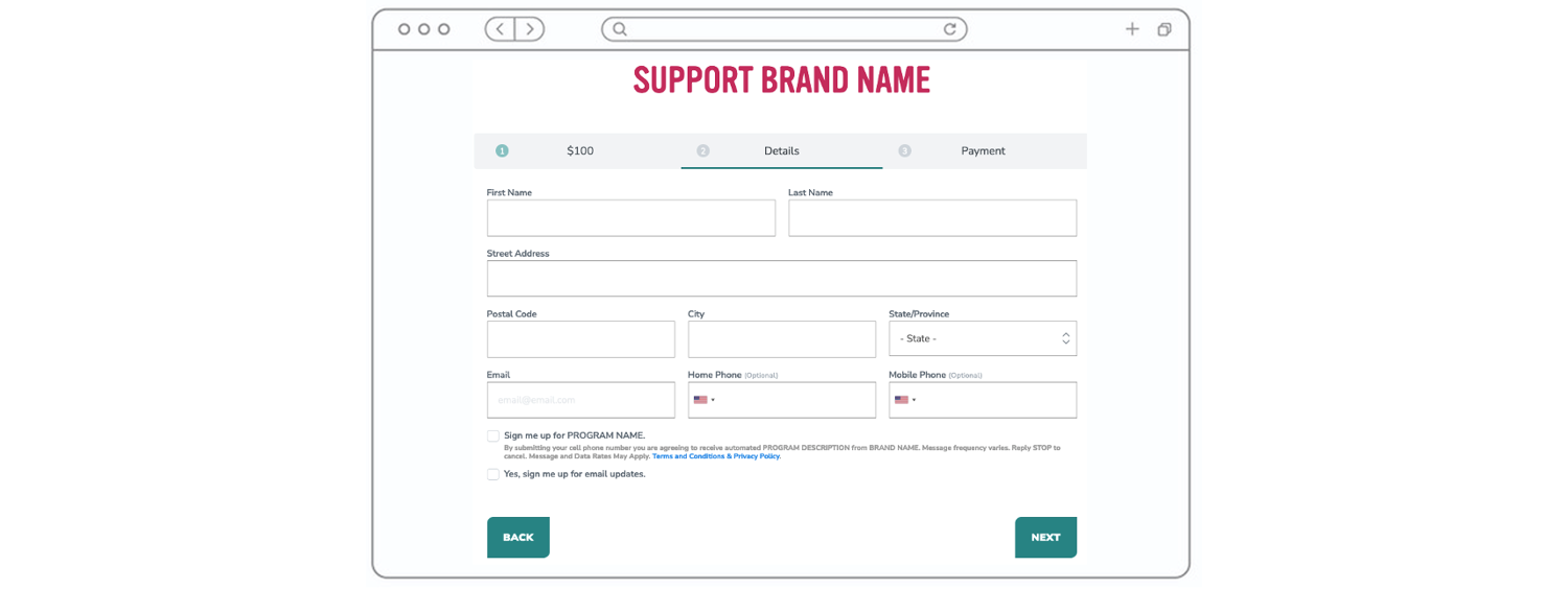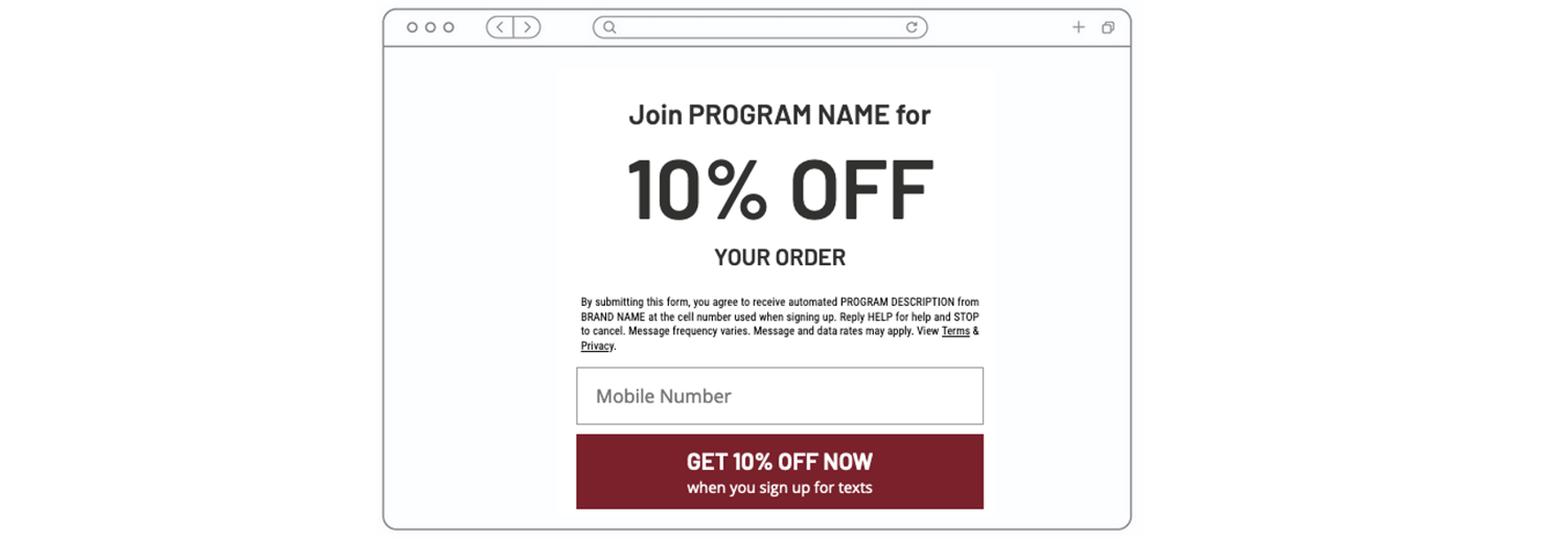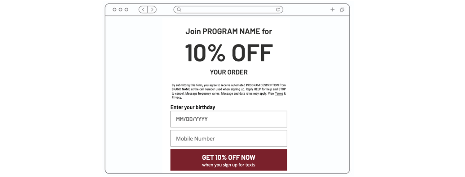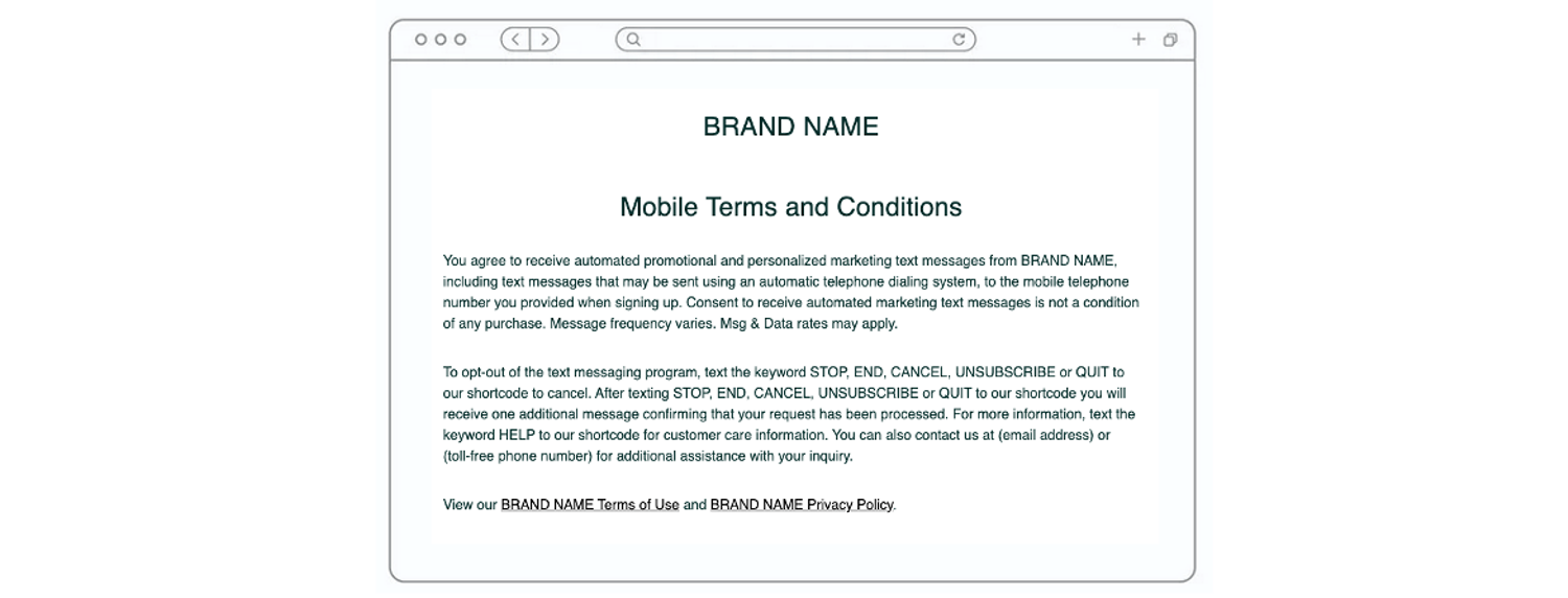 Comprehensive terms and conditions can either be displayed in full directly below the CTA or accessed from a link close to the CTA. The essential requirements for the Terms and Conditions are straightforward. However, many brands choose to include additional details or incorporate an SMS section into their existing terms and conditions.