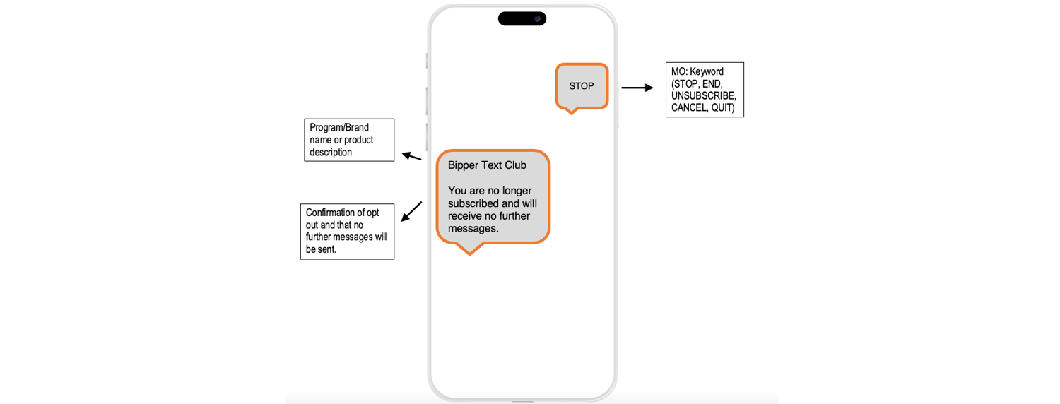 Message senders send an opt-out message after consumers text a keyword indicating they wish to opt out (for example, STOP, END, CANCEL, QUIT, UNSUBSCRIBE). The opt-out message must include the program’s name and confirm that the consumer has been opted out of the program.