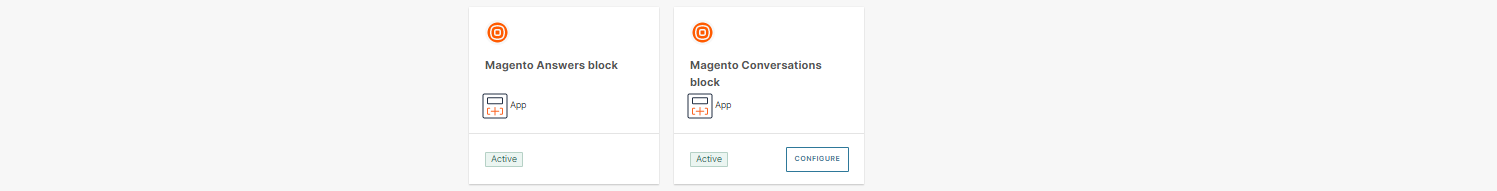 - Go to the Integrations tab. You see the Adobe Commerce (Magento) Answers block card, which is set to Active in the list of integrations.