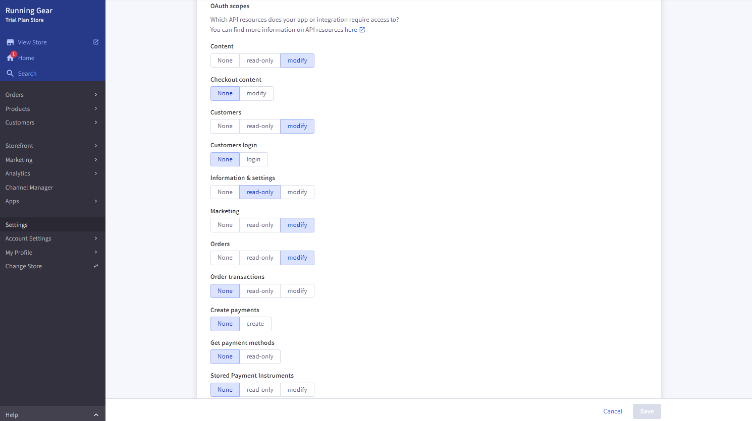 - Under OAuth Scopes, specify the API resources and permissions to which your app/migration requires access. If you want to use this Private app for Next-Cart migration program, set all access levels of the following scopes to either: