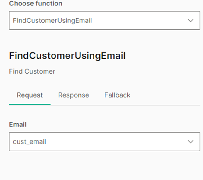 Each function has its own set of parameters in the request tab. For example, the FindCustomerUsingEmail function expects an email address as a parameter. The value filters the BigCommerce customer database for a customer with that email address.