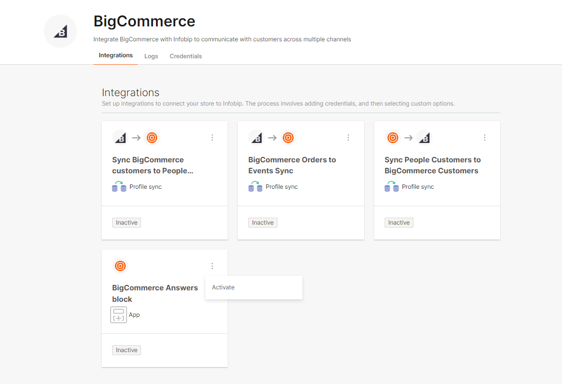 - Sync your customer data to People so that you can use it in all Infobip products. For example, if you use Moments, you can use your BigCommerce contacts in campaigns and broadcasts