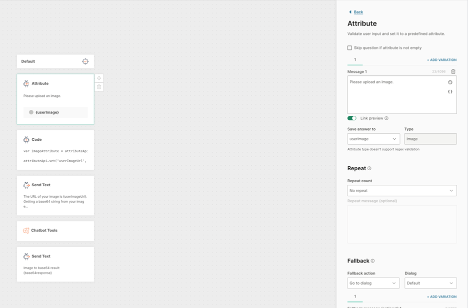 In your chatbot, add the Chatbot Tools in your chatbot dialog. Select the File to Base64function from the drop-down list.