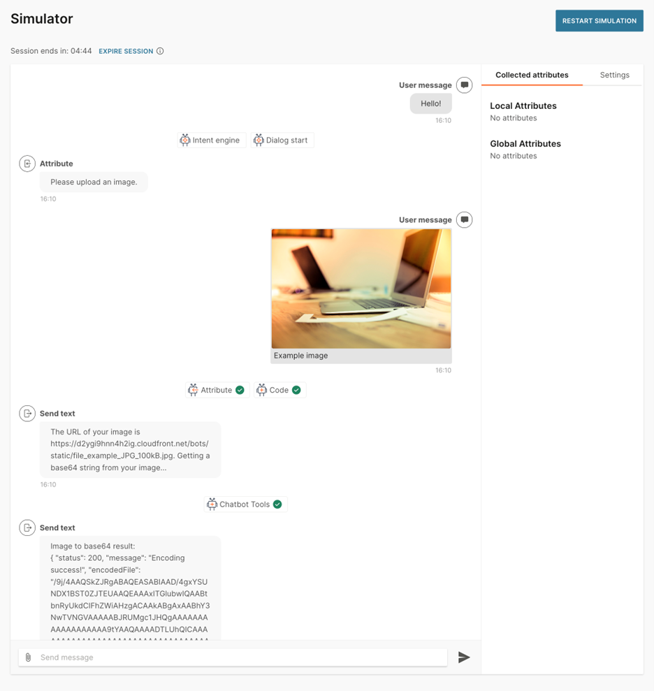 The following Simulator view shows an example of implementing the File to Base64 function.