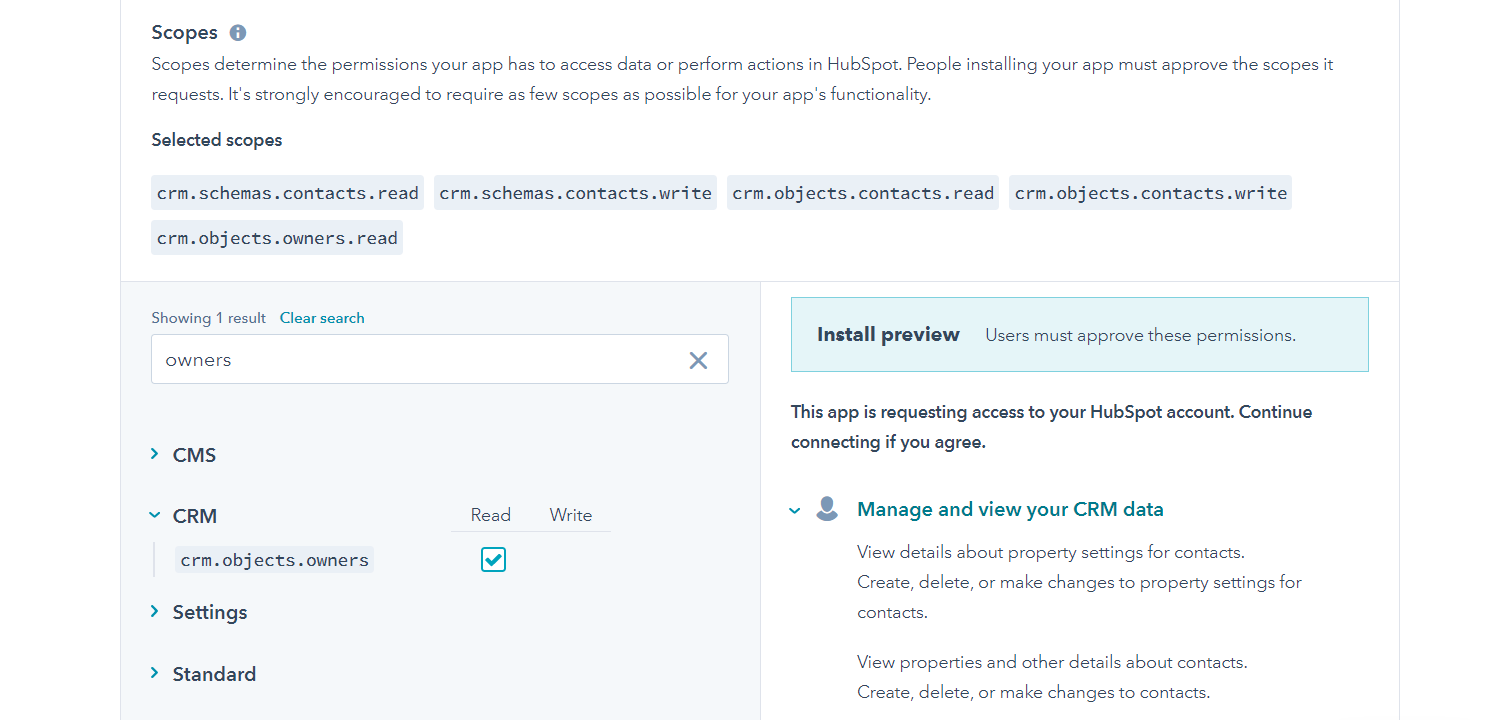 In the Scopes section, select the following scopes: crm.objects.contacts.read crm.objects.contacts.write crm.schemas.contacts.read crm.schemas.contacts.write crm.objects.owners.read Scopes (opens in a new tab) determine the permissions needed to perform certain actions with the integration.