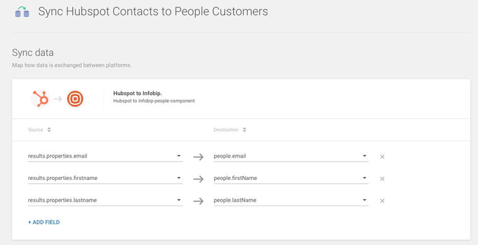 - You then see two columns for source and destination fields. For example, the Source column displays your HubSpot data fields and the Destination column displays the available People fields. Use the drop-down arrows to select how you want the fields to map across HubSpot to Infobip.