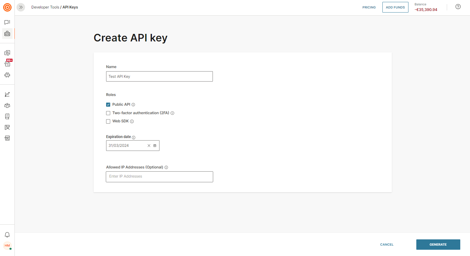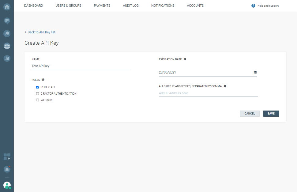 - To create a new API key, click Create API Key. Name your API key, set the expiration date, and select the Public API check box. The Allowed IP address is optional. Click Save.