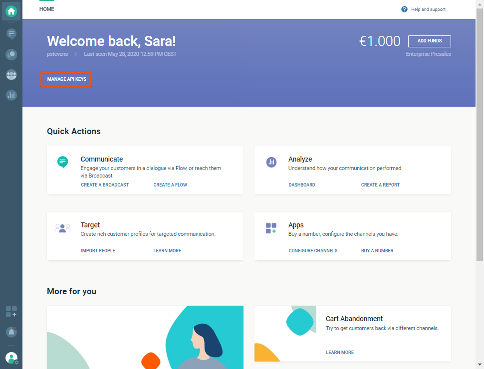 - Log in to the Infobip web interface (opens in a new tab) and click Manage API Keys.
