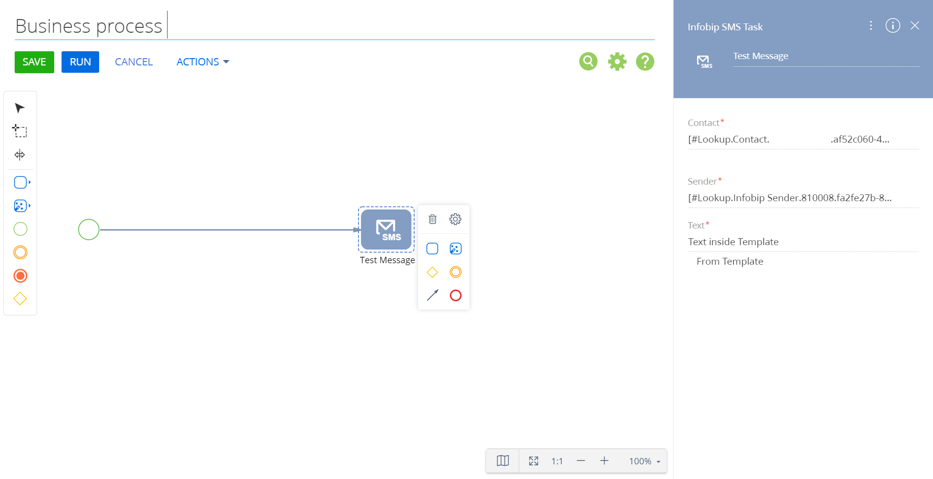 - Click Infobip SMS Task. A form opens with details you need to select, such as Contact, Sender, and Text.